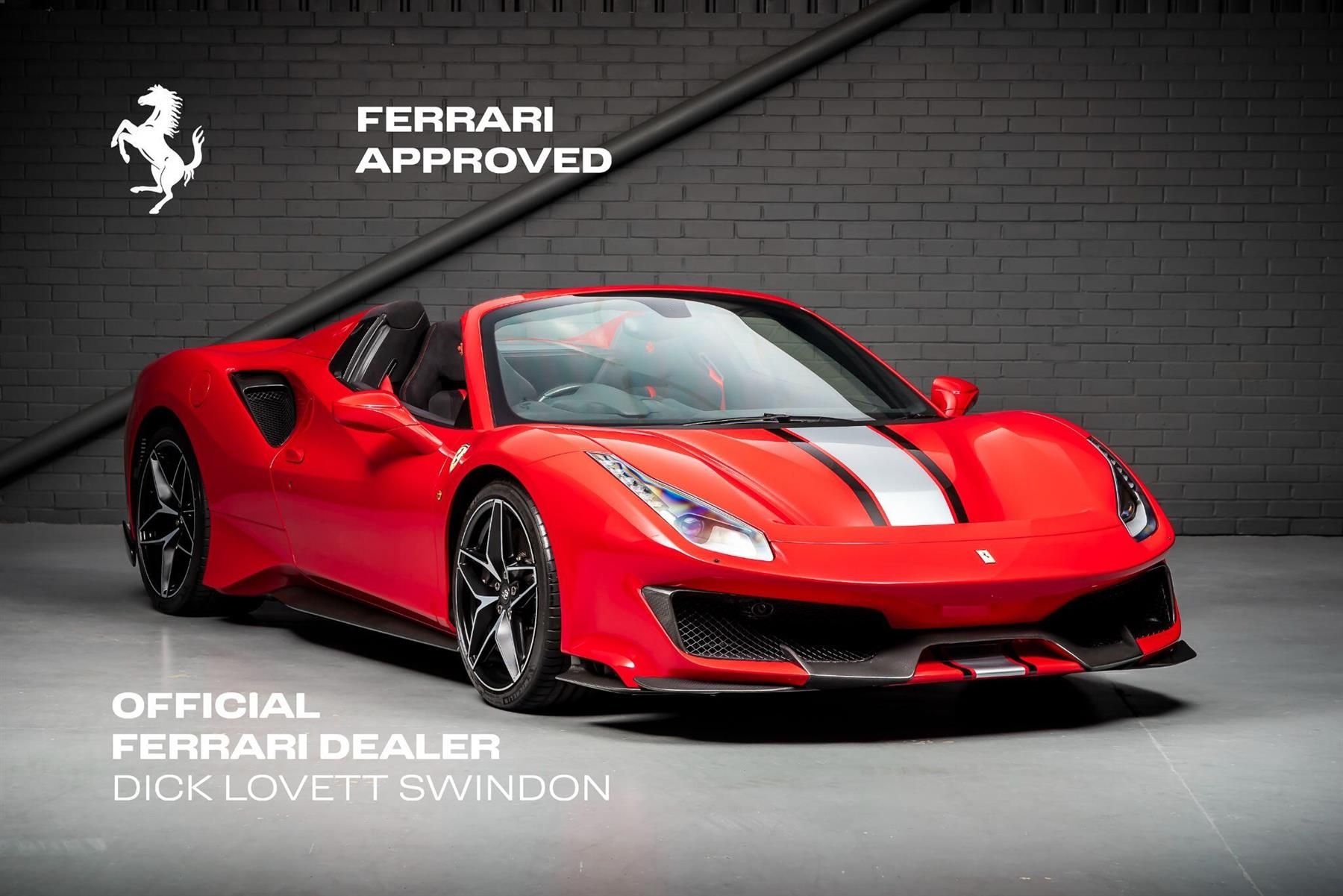 One Owner - 2019 Ferrari 488 Pista Spider13263 MilesRosso Corsa with Grigio Titanio and Nero LiveryNero Alcantara interiorFull Dealership HistoryFully Prepared 'Ferrari Approved' Vehicle2 Year Ferrari Backed Warranty• ACPL – Apple CarPlay.• ALIC – Alcantara interior carpet.• CEFS – Carbon fibre front flaps.• CELS – Carbon fibre side air splitter.• CEL2 – Engine covers in carbon fibre.• CERF – Outer carbon fibre B-post trim.• CEXD – Rear diffuser in carbon fibre.• CEXE – Front air vents in carbon fibre.• CEXS – Carbon fibre underdoor cover.• CISC – Carbon fibre inner sill trim.• CITZ – Carbon fibre upper centre console trim.• CILD – Coloured inner details• CSBT – Coloured safety belts.• CUPC – Carbon fibre hub caps.• DIAL – Single-colour dreamline on F1 paddles• DLU1 – Dreamline on upper steering wheel rim• EXAB – Black tailpipe tips.• FLAX – Long, narrow Italian flag motif• FLMA – Additional coloured mats with logo.• GRDC – Carbon fibre rear moulding.• HELE – High emotion low emission.• LOGO – “Scuderia Ferrari” shields.• MIR2 – Int./Ext. electrochromic mirrors.• NAVC – RadioNavi system + Bluetooth.• PAC1 – Parking camera.• PNT9 – Extended racing livery.• RPMY – Yellow rev. counter• RSCF – Carbon fibre racing seats(Large Size).• RSCH – Racing seat lifter.• RSFD – 20'' forged diamond wheels.• SNFJ – Integrated audio system• STC1 – Coloured standard stitching (O.R.)Vist our showroom to appreciate this very sought-after, stunning Ferrari 488 Pista. Dick Lovett Ferrari, Europe's leading Pre-Owned Ferrari Dealership.