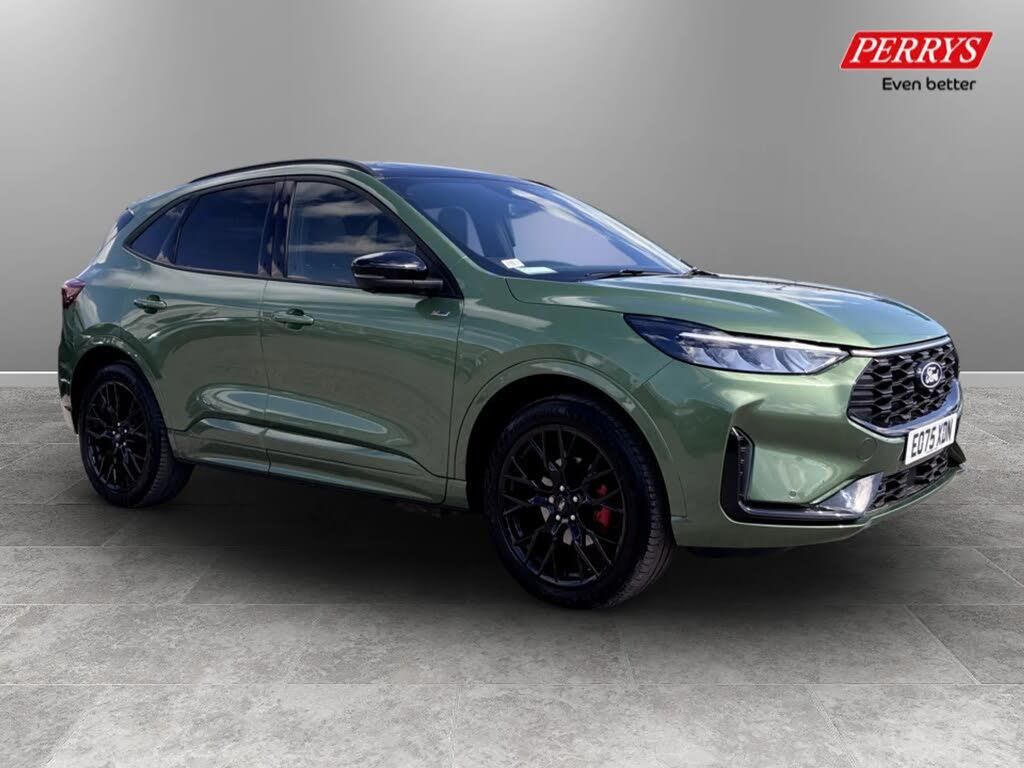 12.3" digital colour instrument cluster,360 degree view camera,Clear exit assist,Cross traffic alert with active braking,e-Call (emergency call),Ford easy fuel,Ford SYNC 4 Navigation with 13" touchscreen, DAB radio, emergency assistance, Andriod Auto/Apple CarPlay, 5G modem & Ford Pass connect,Front and rear parking sensors,Hands free power tailgate,Lane centering assist,Lane keeping aid with lane departure warning,Power assist steering,Reverse brake assist,Selectable drive modes,Service interval indicator,Sports suspension,High performance (700W) B&O premium audio system with enhanced sound tuning, 10 speakers including upgraded door speakers, subwoofer and 2 USB ports,Auto headlamps with high and low beam,Black roof rails,Body colour bumpers,Front LED fog lamps,Large rear spoiler,LED daytime running lights,LED rear lights,LED third brake light,Pop out door edge protectors,Power front/rear windows with global close,Power heated folding door mirrors with puddle lights, memory function and camera,Power opening panoramic roof,Quickclear heated windscreen,Rain sensing wipers,Rear privacy glass,Rear side wing doors,Rear wiper,ST-Line body styling with black painted bumper details and black mirror caps,2nd row sliding seats,Electronic automatic temperature control (EATC),Front and rear head restraints,Partial premium touch sensico upholstery,Rear centre head restraint,Single front passenger seat,Sports seats,Driver assistance pack - Kuga Auto,Winter pack - Kuga,3x3 point rear seatbelts,Airbags - front driver/passenger, front and rear curtain,Drivers knee airbag,Dynamic brake support,Electronic stability control (ESC) and ABS,Evasive steering assist,Ford MyKey Gen 2 safety system,Manual child proof rear door locks,Pre collision assist with autonomous emergency braking,Rear seat Occupancy alert,Red brake calipers,Tyre pressure monitoring system,Engine immobiliser,Keyless entry and Ford power start button (Keyless start),Locking wheel nuts,Remote powered central double locking doors,Thatcham category 1 alarm,20" Black Ford performance wheels,Bursting Green,Head-Up Display,Home Socket Charge Cable - In Addition to Single Phase Charge Cable