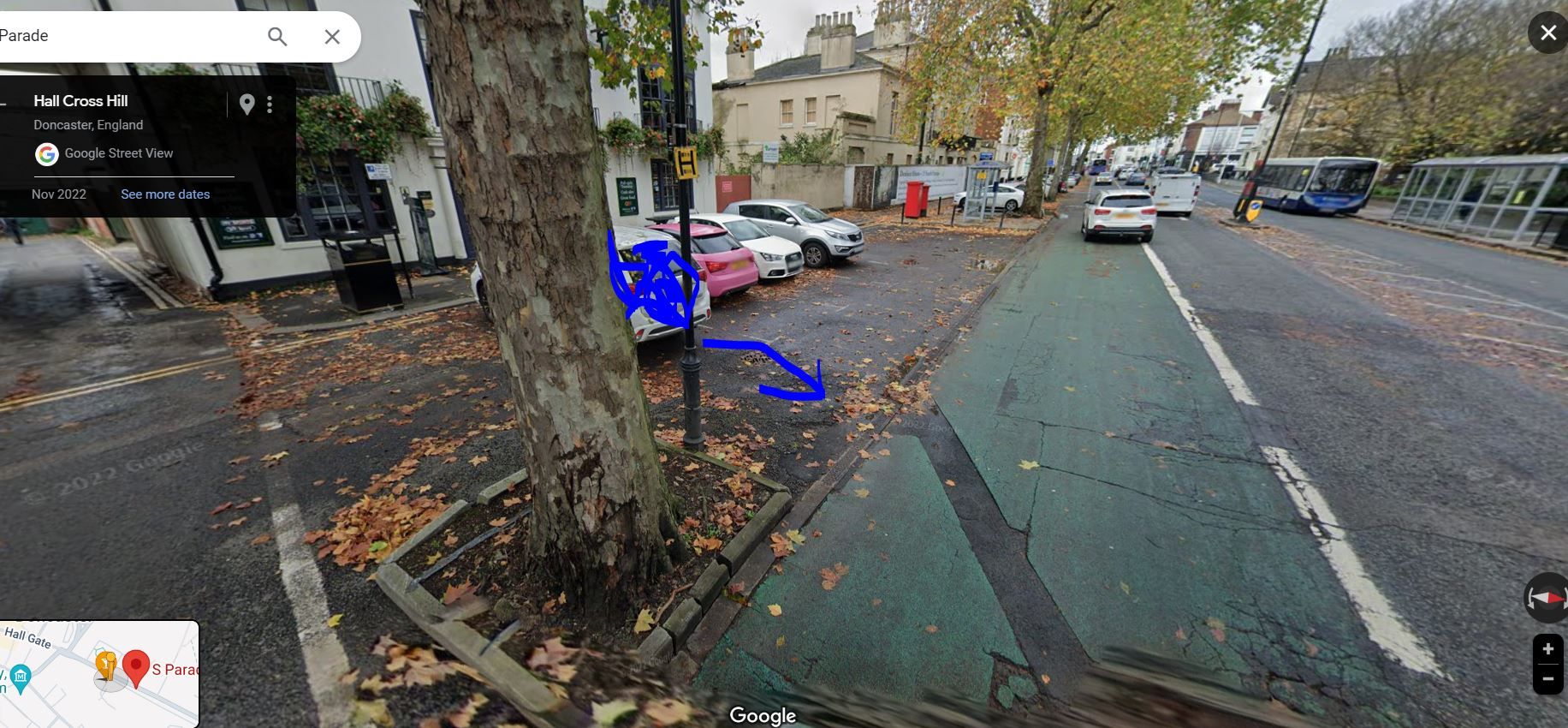 She had been parked where the white car (that I have artistically coloured blue) was. She reversed out into the Bus Lane. The words Bus Lane have been added after the repaint, but she would have reversed over it and not seen it then.