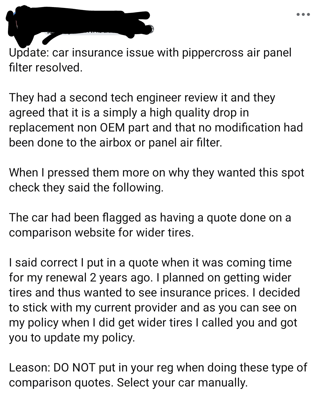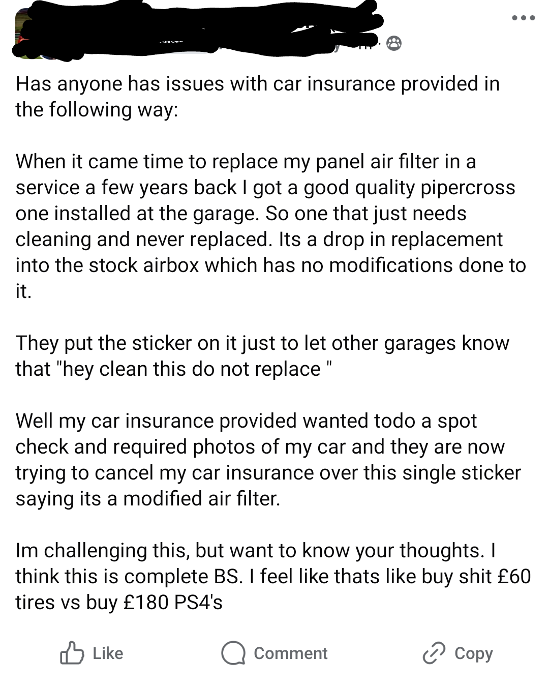 Also, based on the pic in the OP, and some future replies regarding replacing the filter in the standard airbox with an OEM filter, Pipercross isn't the OEM air filter for the car listed, it's a well known aftermarket / modification brand (despite the fact it will make no power difference) so if the car was declared totally standard by the owner when they knew the new filter was aftermarket / modified (confirmed by the OP screen grab) then technically in the eyes of their insurer it's now a mod. Ironically one that most specialists / brokers wouldn't even care about or charge more for if you honestly declare it.