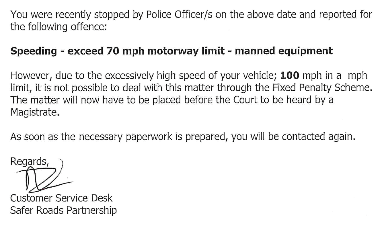 Not me I hasten to add. One of our sales reps got this letter today. He'd already told me he'd been pulled over but during the conversation the officer had pointed out he was doing 90mph and that he should expect something in the post.