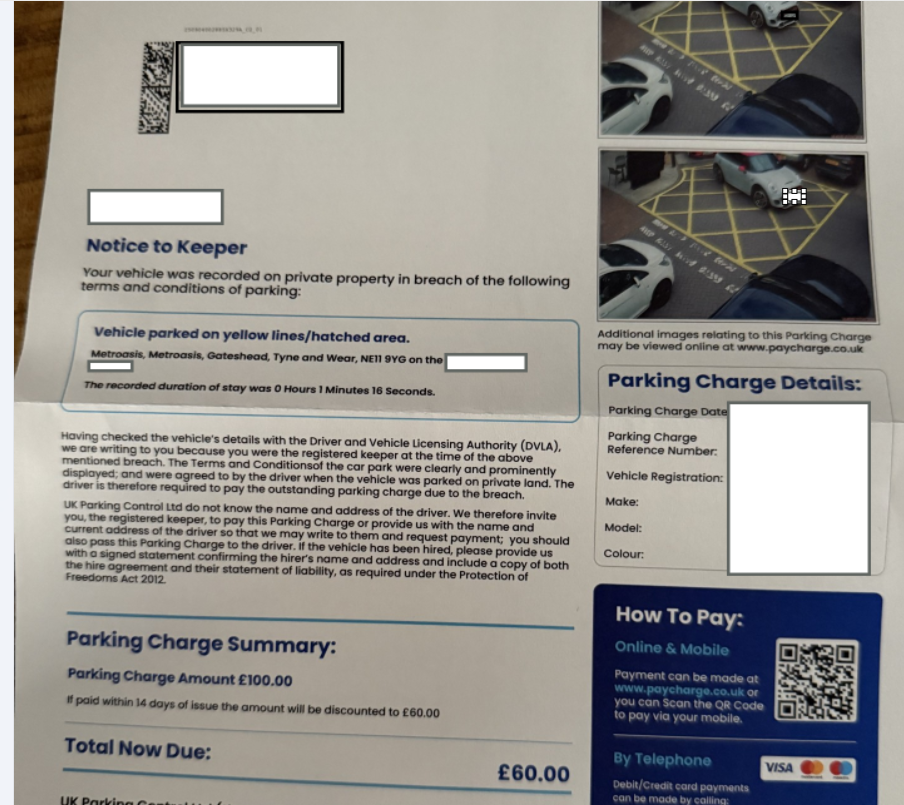 I don't really think a £60.00 fine is correct for being stuck getting out of a car park.
