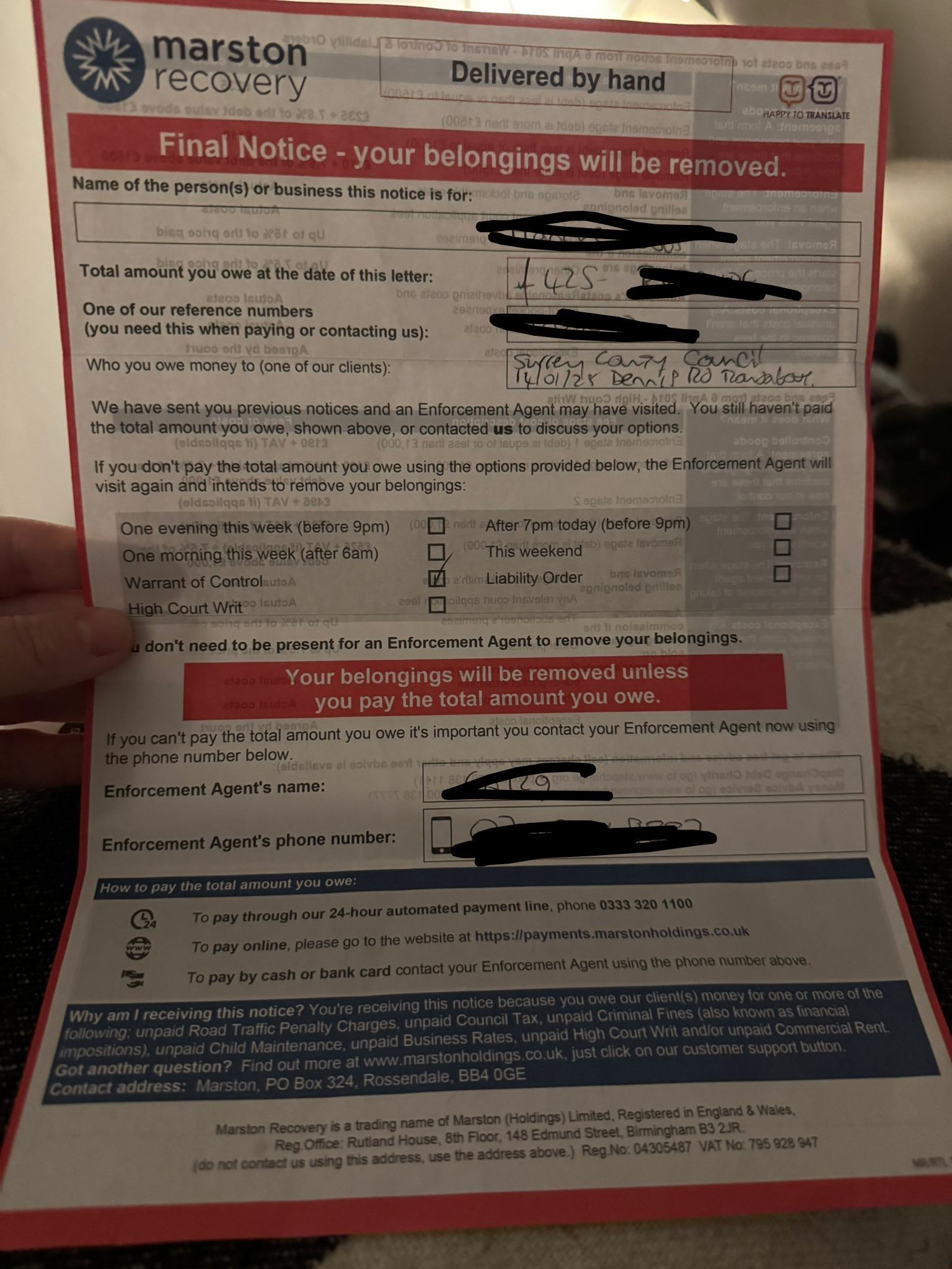 Don't delay on the payment if that's the chosen course of action. If they do send actual bailiffs to seize property, costs will get added on at stupid levels.