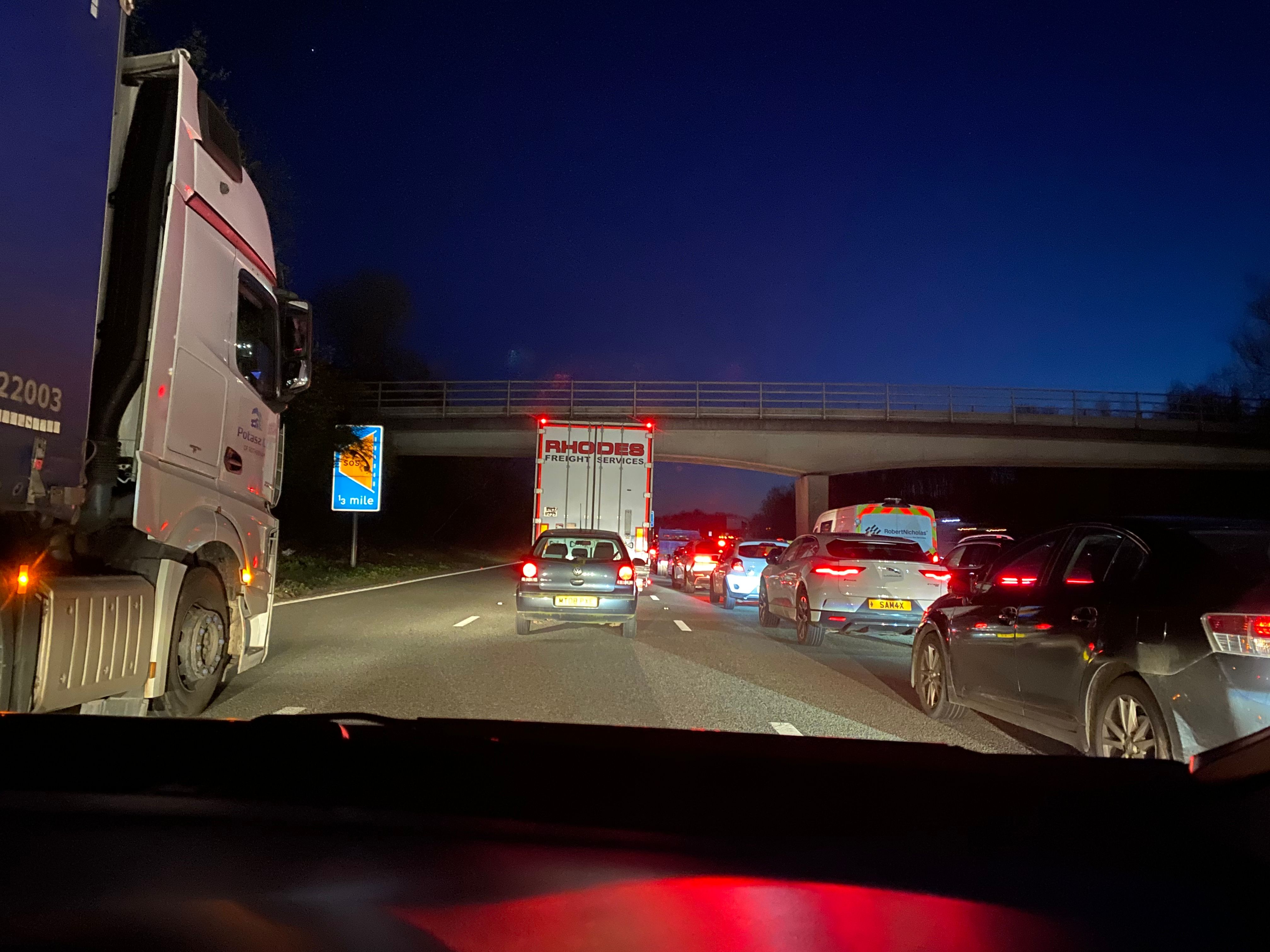 On the way back I could see the first Police car stuck trying to get through about 2 miles back, 4 miles back was a fire engine and 5 miles back was an ambulance. Lane 1 with the Red X was completely filled with cars and lorries.