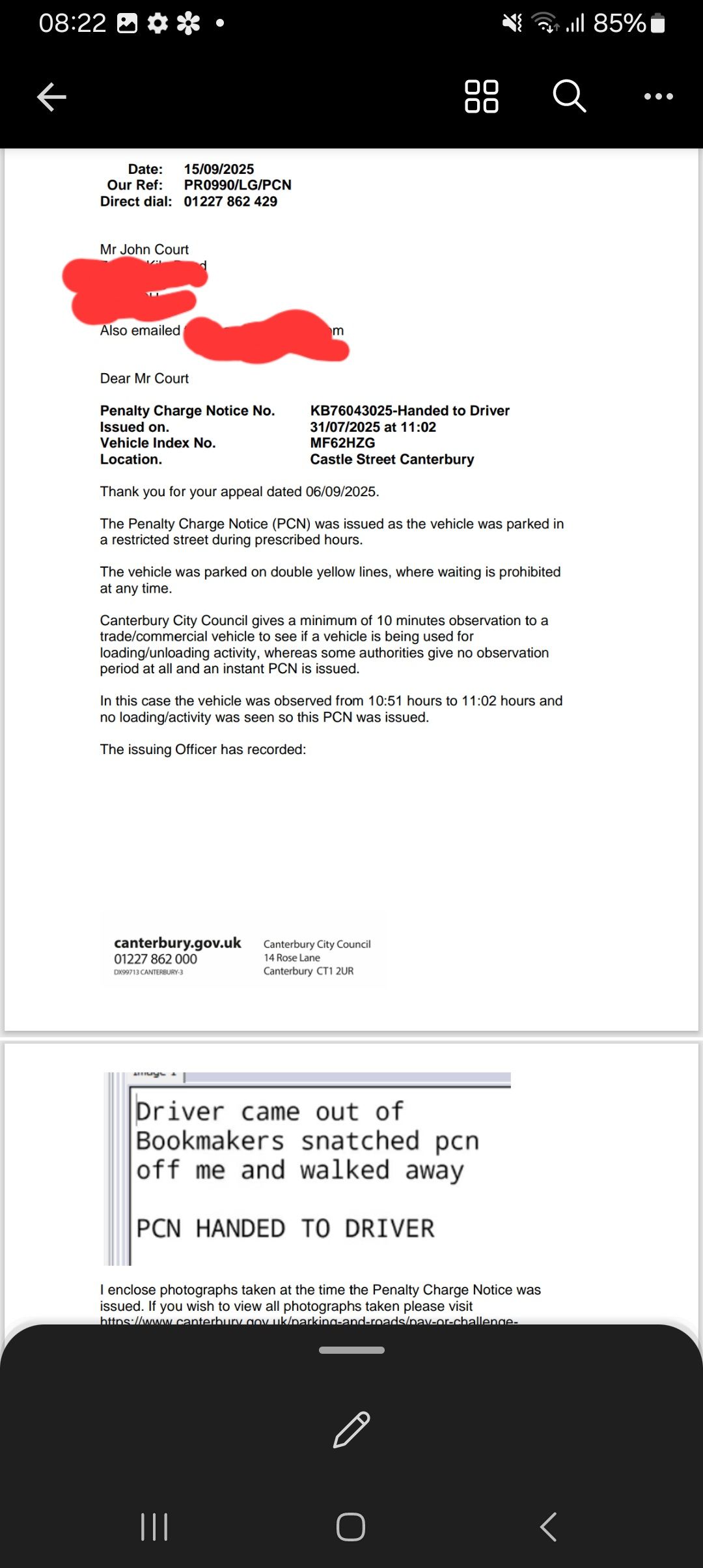 There was a written note added to the review decision from the warden: "Driver came out of the betting office and snatched ticket from me and went back into the betting office, ticket issued direct to driver".