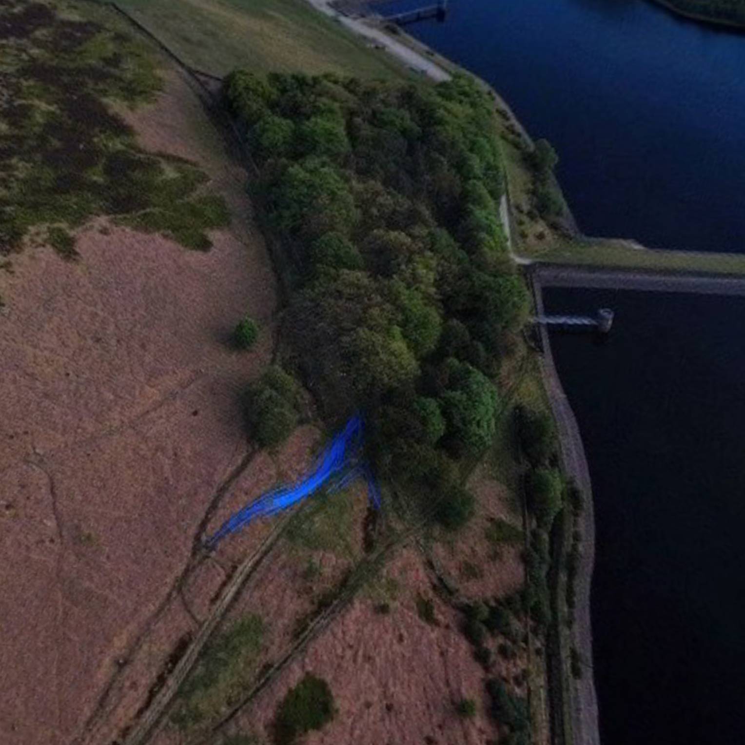 Someone I follow on Facebook took this with a drone. It's above Upper Dean Head reservoir near Halifax in West Yorkshire. I'm curious as to what the bright blue is...