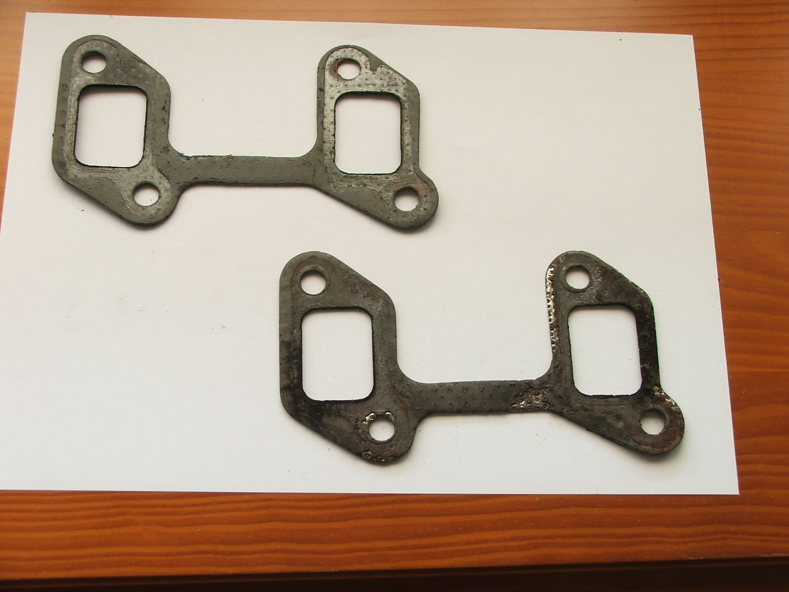 Here are the removed gaskets, manifold side up. The bottom one is the blown one. It looks as if both cylinders have been blowing in fact, although I only noticed the back one.