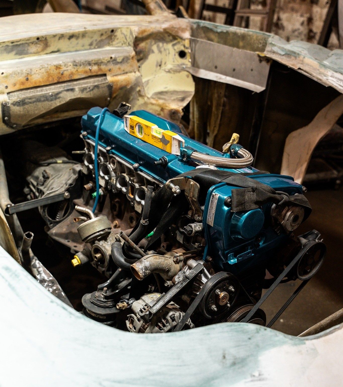 From what I understand, the car was fire damaged and acquired minus its engine. There was an unattached engine and box from a Skyline and they thought to marry the two. frontfloater said: