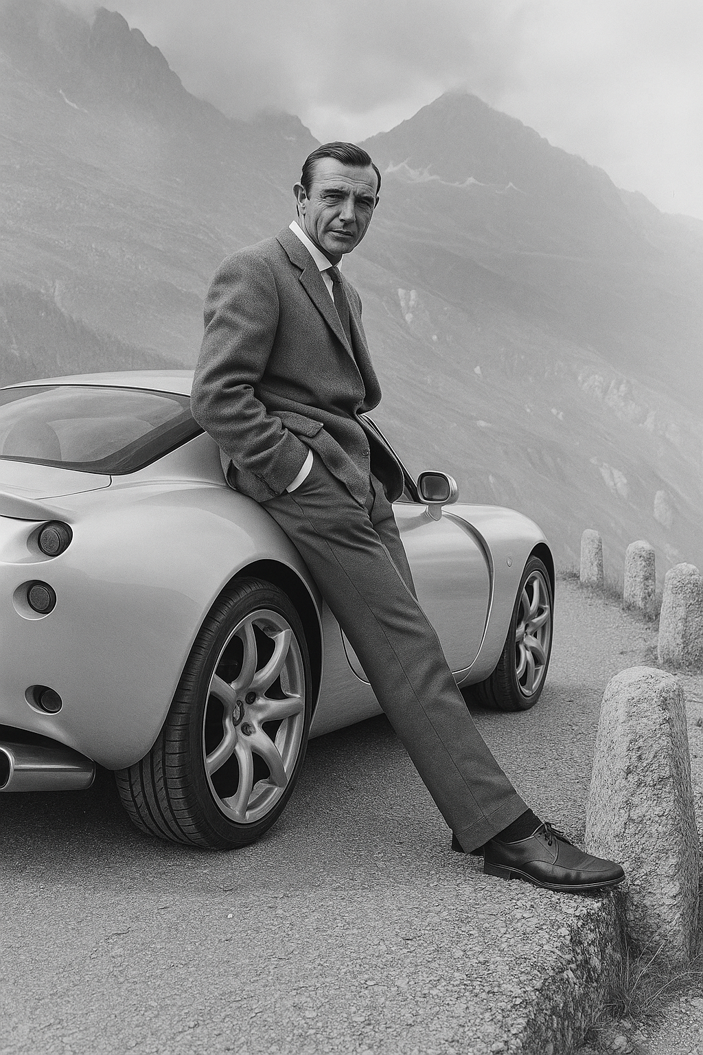 No worries. I took a screen shot of a Google image of Sean Connery and a side on picture of my Tuscan and uploaded both to ChatGPT. I then asked it to replace the original car in the mountain picture with the tvr in the other image.I then had a couple of tweets, as it put the car around the wrong way and stuff but you can simply ask it more questions. For example I asked to change the car to a lighter colour, it asked me a question back about what colour I actually wanted (including if I wanted Aston Martin’s silver…which I thought was clever) and it came back with this.
