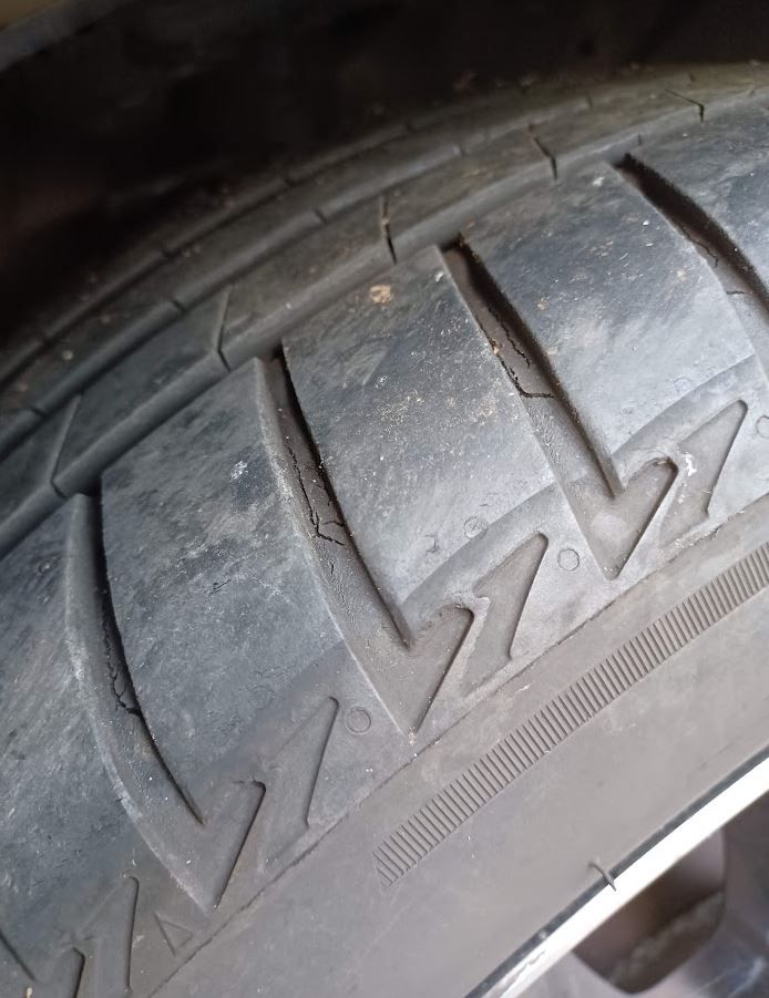Bit fed up. Bought 2 new Bridgestone tyres 2 years ago. Still plenty of tread on them, but there are cracks developing in the tread between every block. The supplier I bought from, despite offering a "lifetime warranty" against manufacturing defects, and despite admitting that the recommendation should be to change these tyres, is unwilling to offer any refund, full or partial for this apparently early failure of the tyres. Here's a picture: