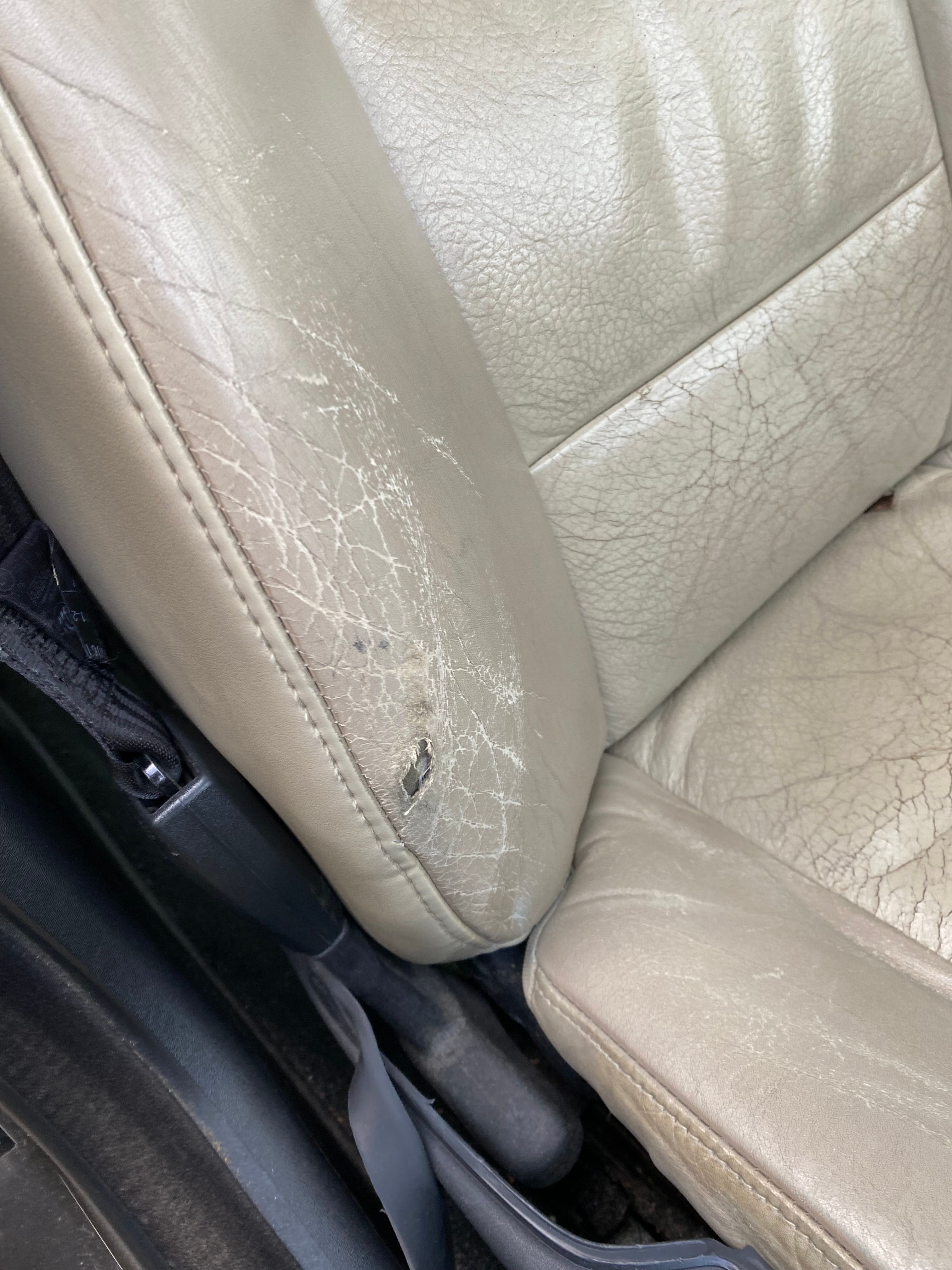 Can anyone suggest a kit / way to DIY fix my leather seat on a 90s Nissan Patrol? An instructional sticker which had been stuck on the drivers sun visor fell onto the seat and adhered itself to the grey leather during the summer. I inadvertently pulled it off and it pulled the top layer of grey leather with it. Incidentally I also have a beige bolster on my Volvo that needs fixing. Is there a kit that can do both? I’ve attached photos..