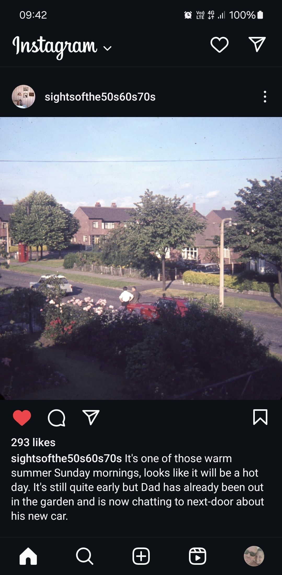 An account I follow on Instagram, can't identify the red car partially obscured by the bushes. It's big, judging by the Anglia and A40. Could it be a Mustang? Rare at the time if so.
