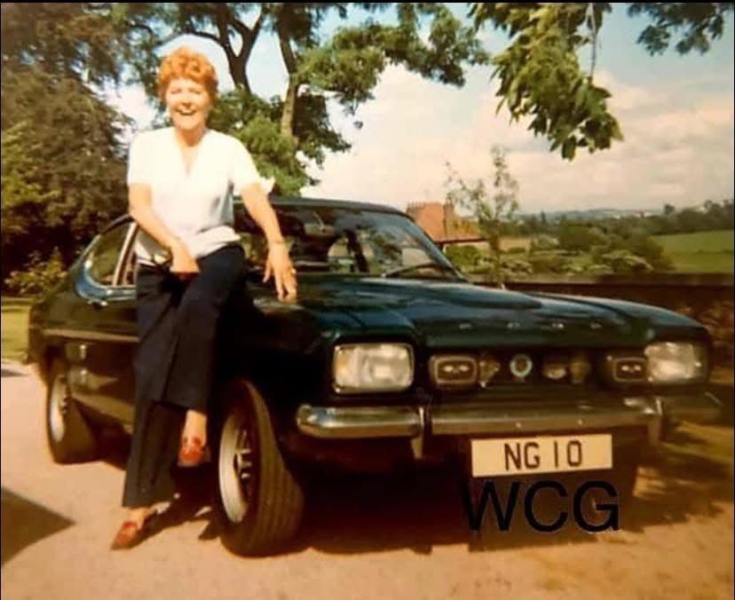 She is seen here with a very early 3 Litre Capri, most likely a 69 or 70 model, in Green and probably a 3000E.