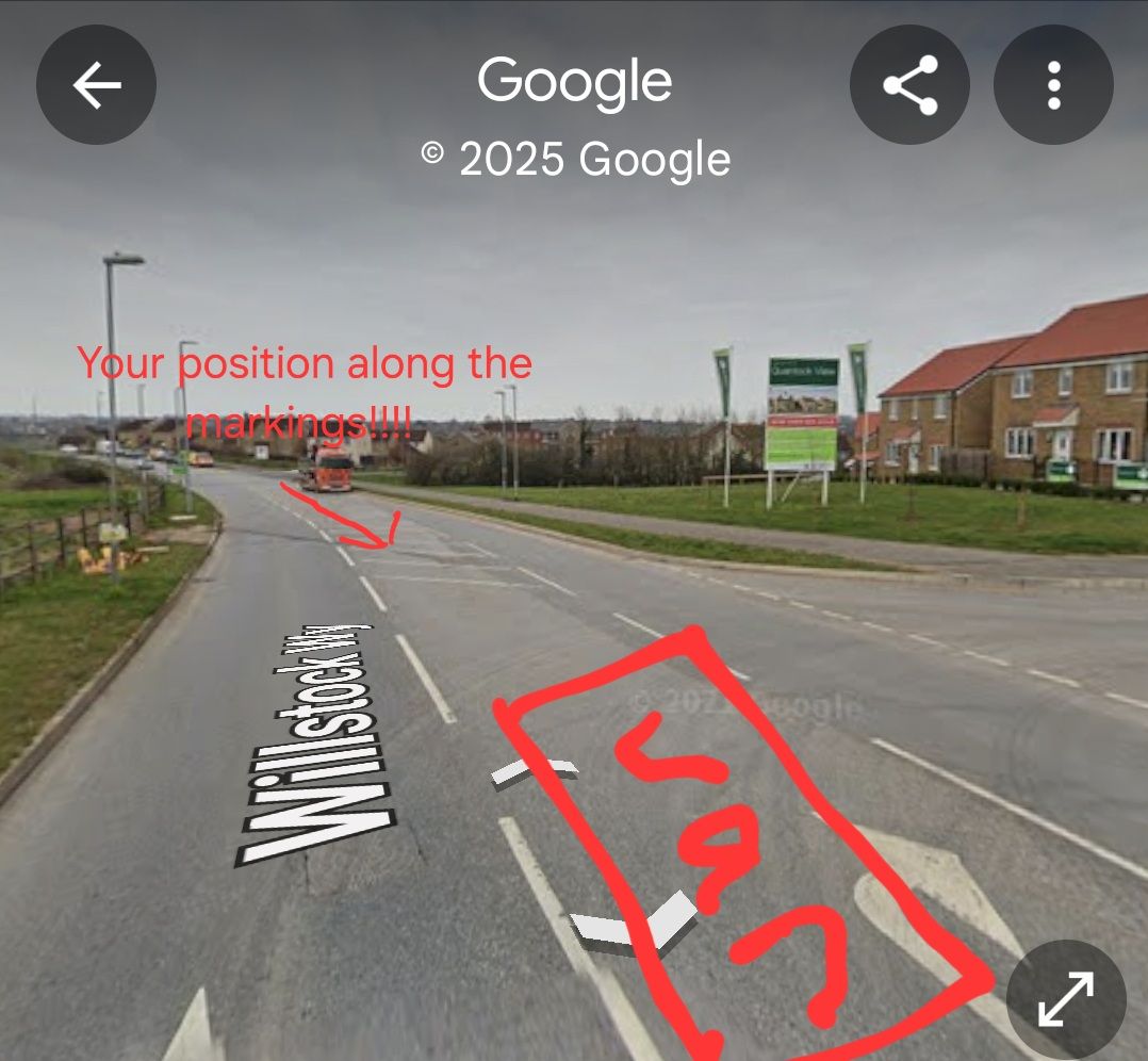 Are you asking what the van in the turning right box waiting to turn right should do, or the car driving along the middle of the road in the hatched area? The car in the hatched area marked 'your position along the markings' should have got back on his own side of the road after passing the parked cars. The van should wait for him to pass, then when clear, turn right. Don't see the difficulty. Can't see why any car would stop in a hatched box in the middle of the road for no reason.Basicly a van turning right into Wigeon road however there is a car oncoming. The oncoming car, rather than getting back Ieft to pass and then getting back out once passed the van has continued to approach down the centre of the road and has stopped dead in the road (still in the centre) facing the van. This happens a lot, most people get back left and then pass allowing the van to then turn right into the road.