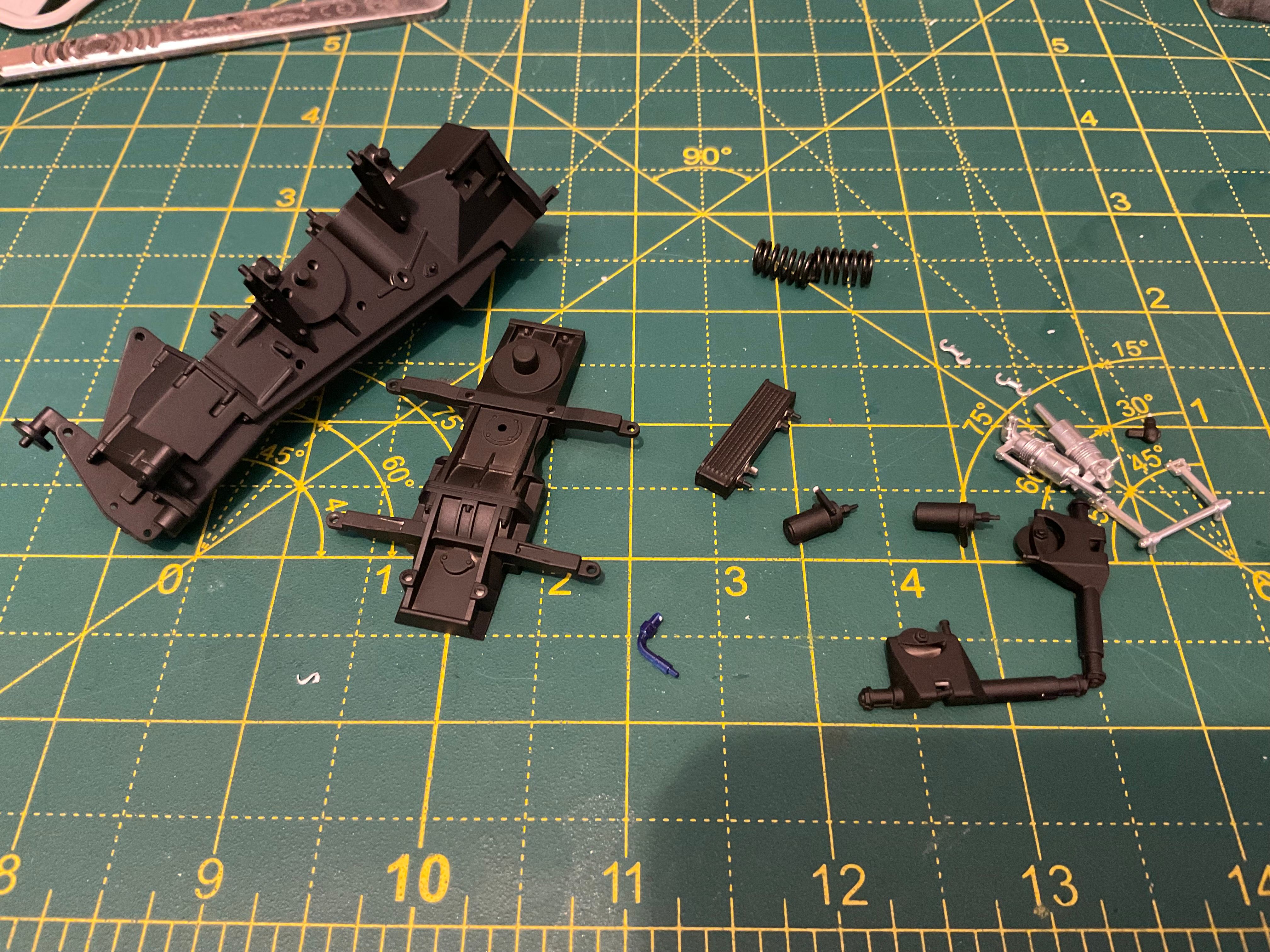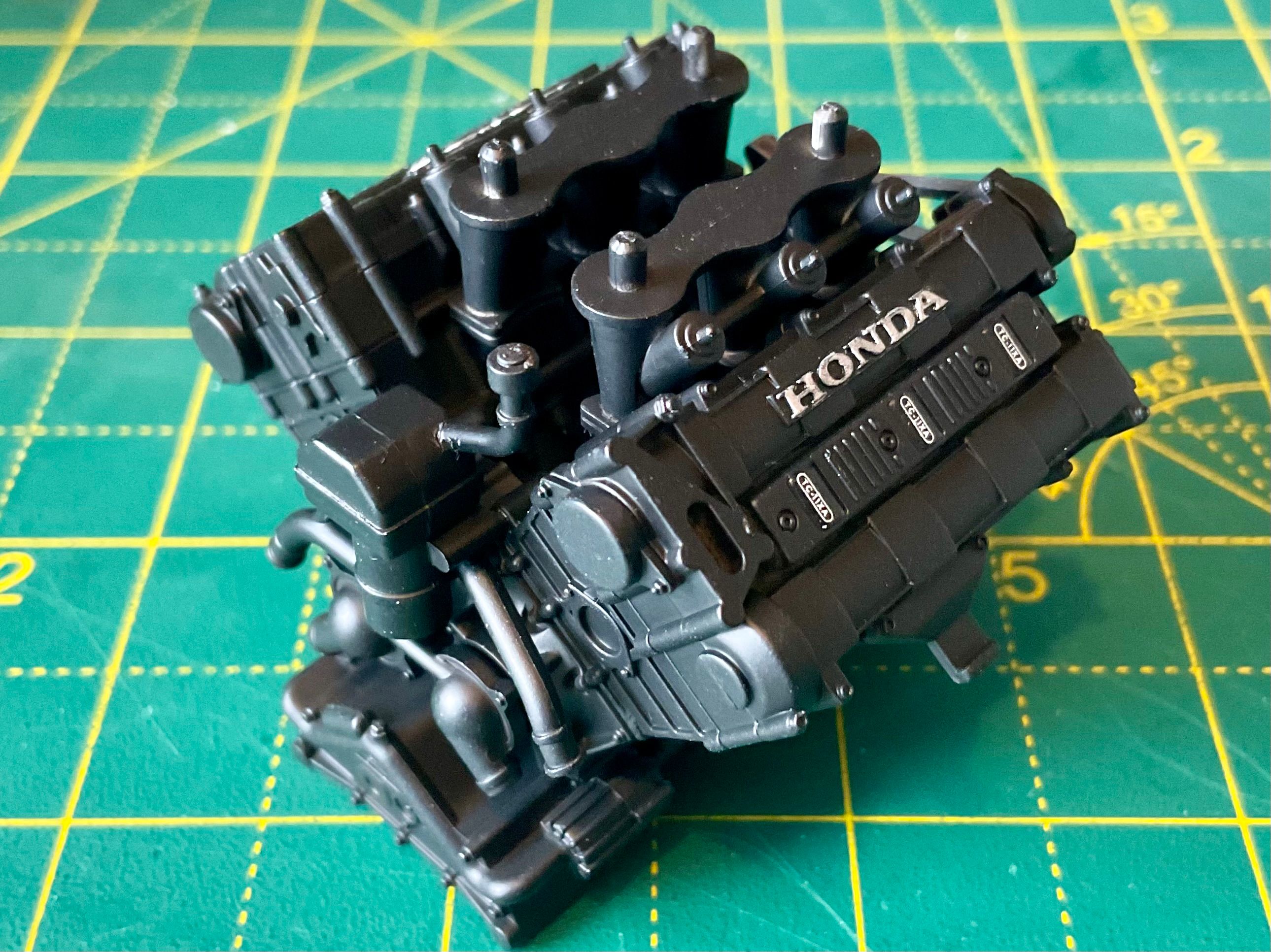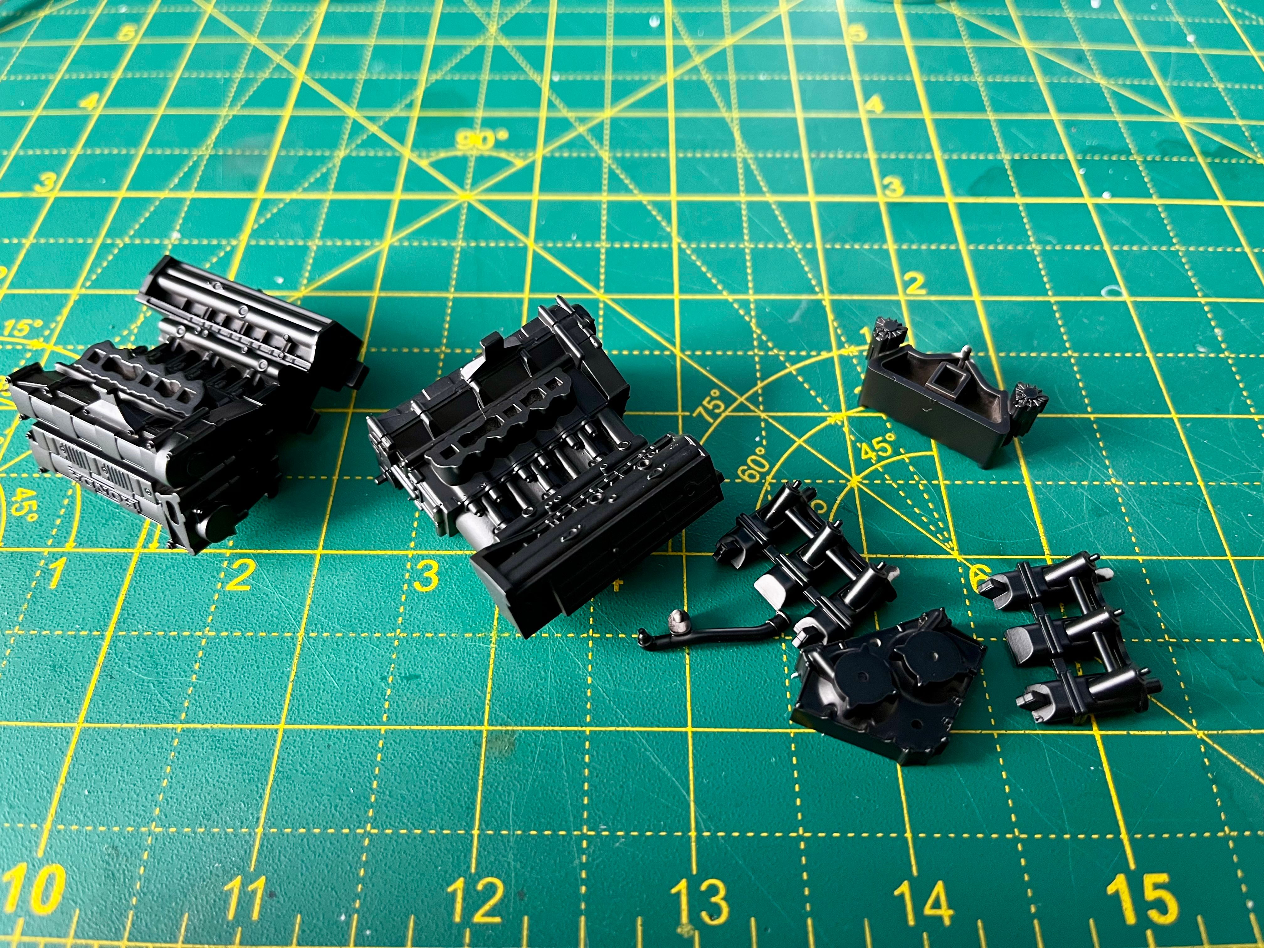 Assembly starts with the Honda's RA168E 1.5-litre V6-turbo. Lots of parts most of which end up black. The kit calls for gloss black, but reference photos and the absolutely excellent Jay Emm deep dive video on YouTube suggest semi gloss black is the way to go. Tamiya semi gloss is a little too gloss, so I mixed in a little flat black too.
