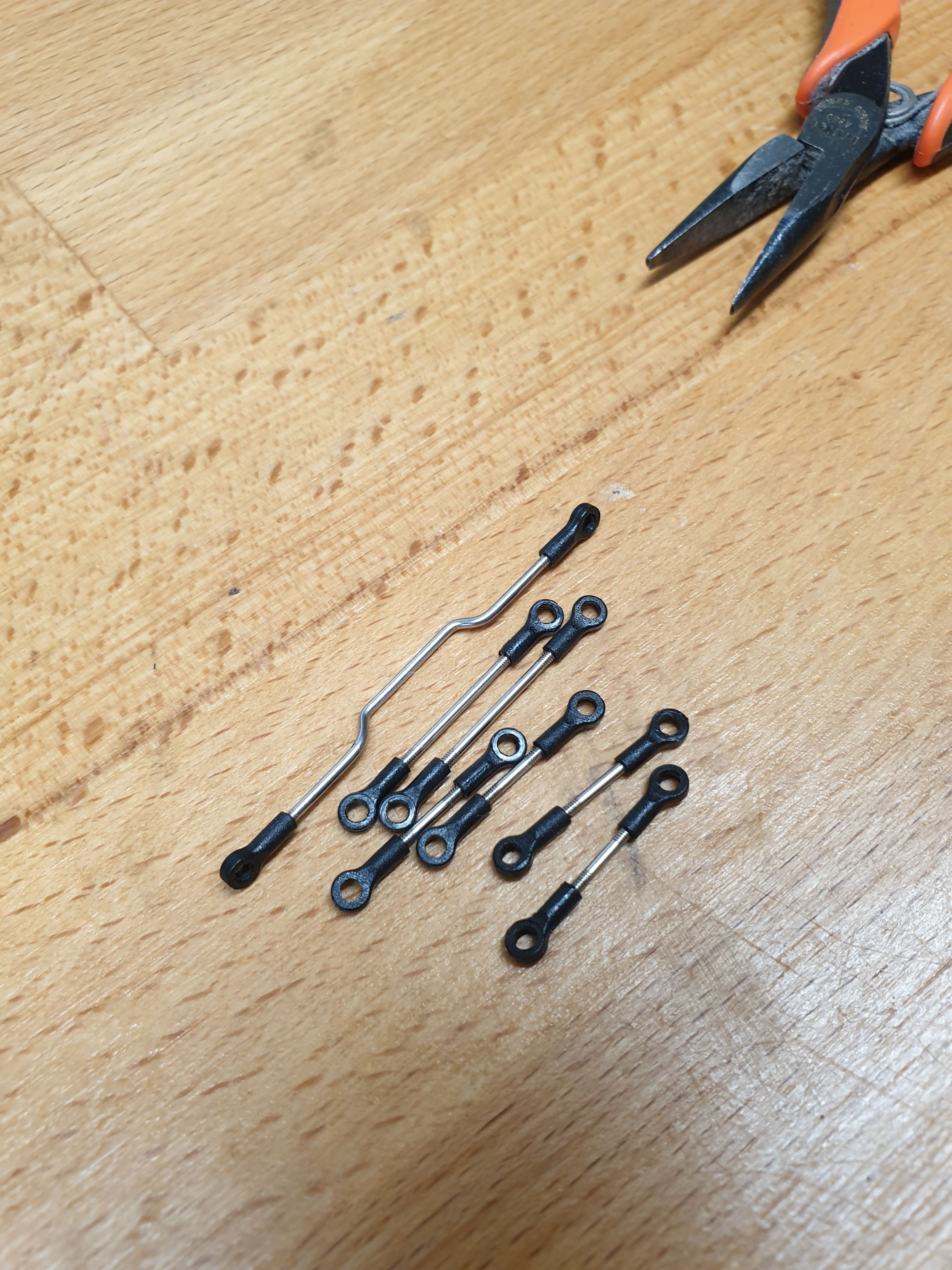 First step is to make up a load of little link bars - these are for the steering and the suspension. Not too tricky, though they have to be rather specific lengths when finished (four are "about 7mm", one is "14.2mm"). The wiggly one arrives straight - you have to bend it as per a 1:1 drawing in the instructions, which is a bit fiddly (apologies for using that word a lot) but more straightforward than I'd expected. You do need two fairly small pliers for that - I have some nice little Bahco ones, but a jewellery-making set would do perfectly well for a lot less money.