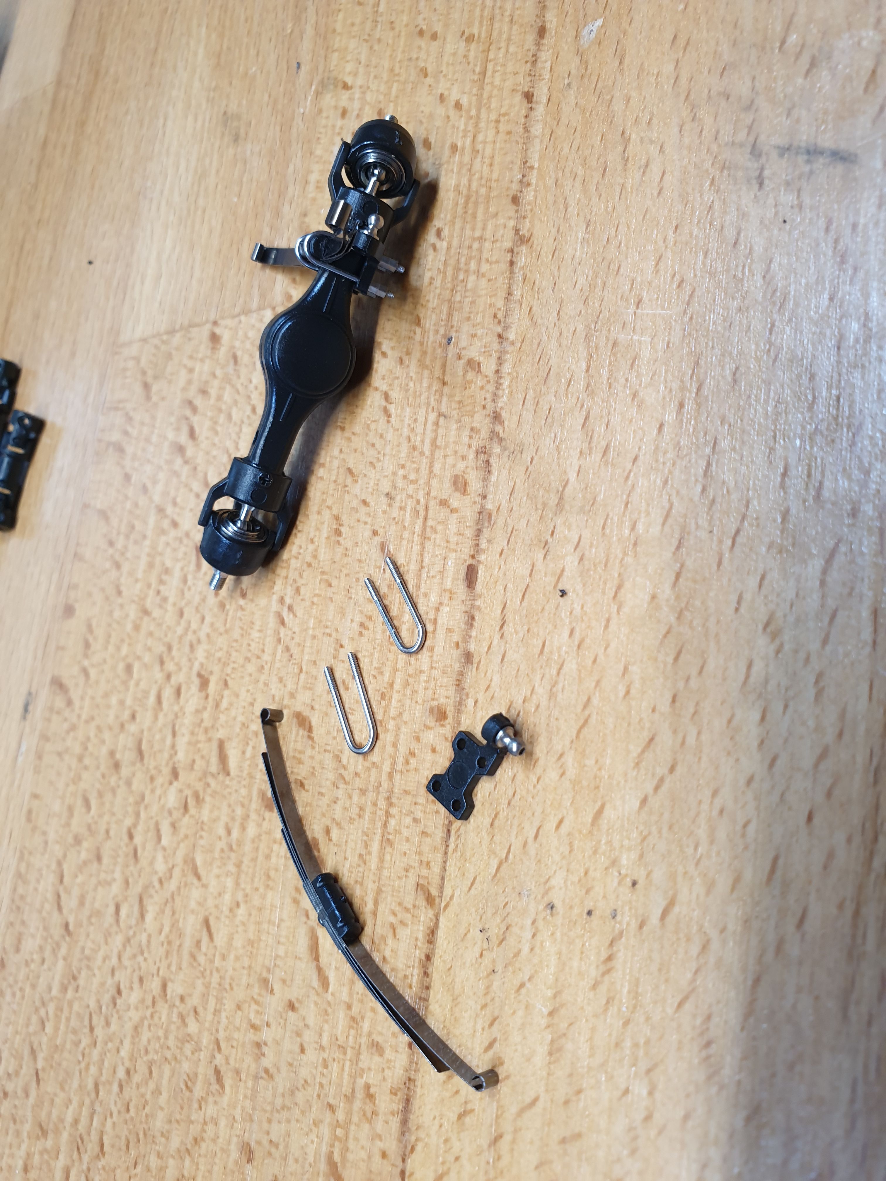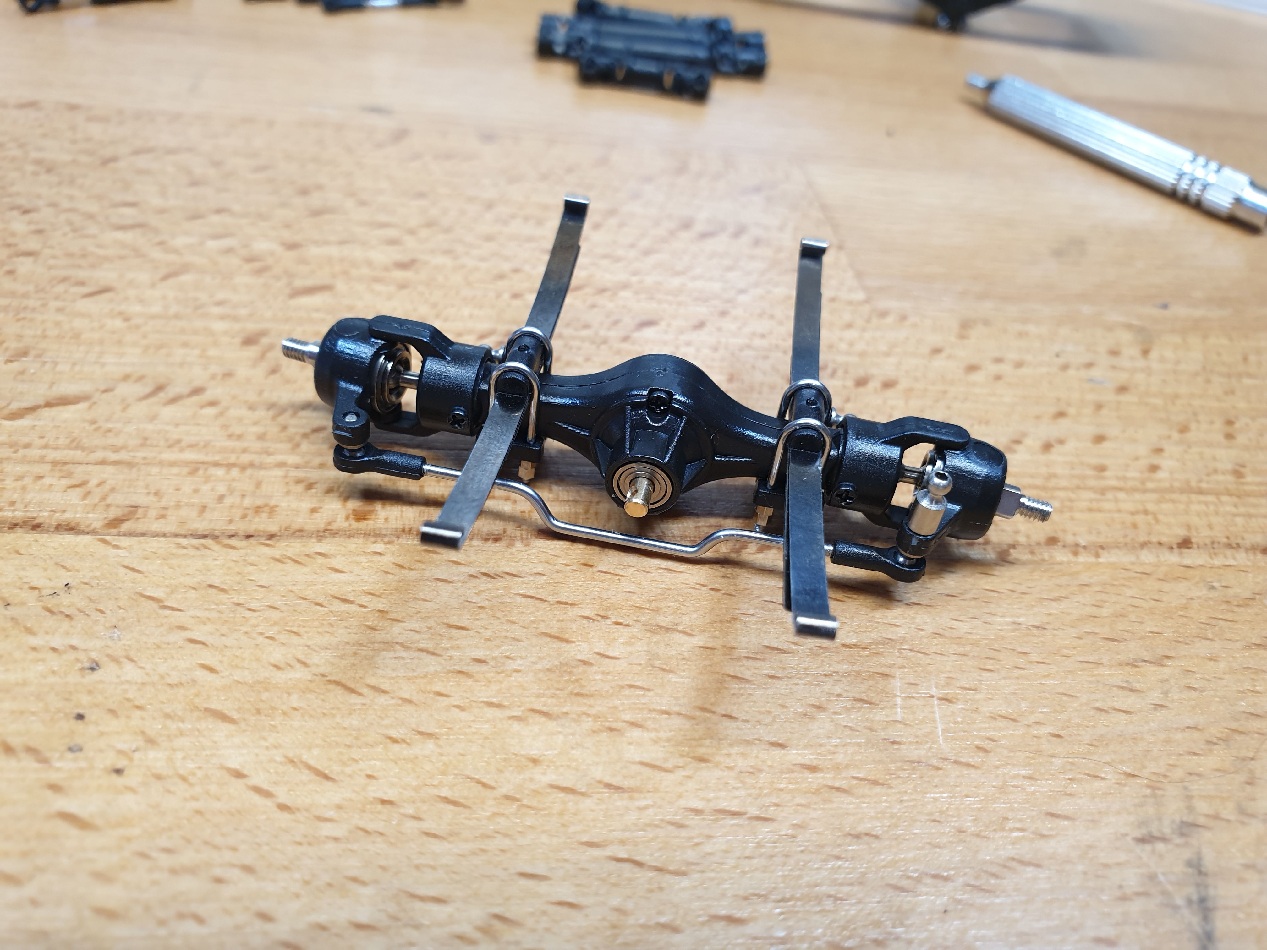That's probably it for today because I have quite sore fingers from the drive shafts. I did add the suspension hangers to the chassis, so next step is to fix the front axle in place. I should point out that I am actually quite enjoying this, in case it seems like a non-stop moanfest about how small everything is.