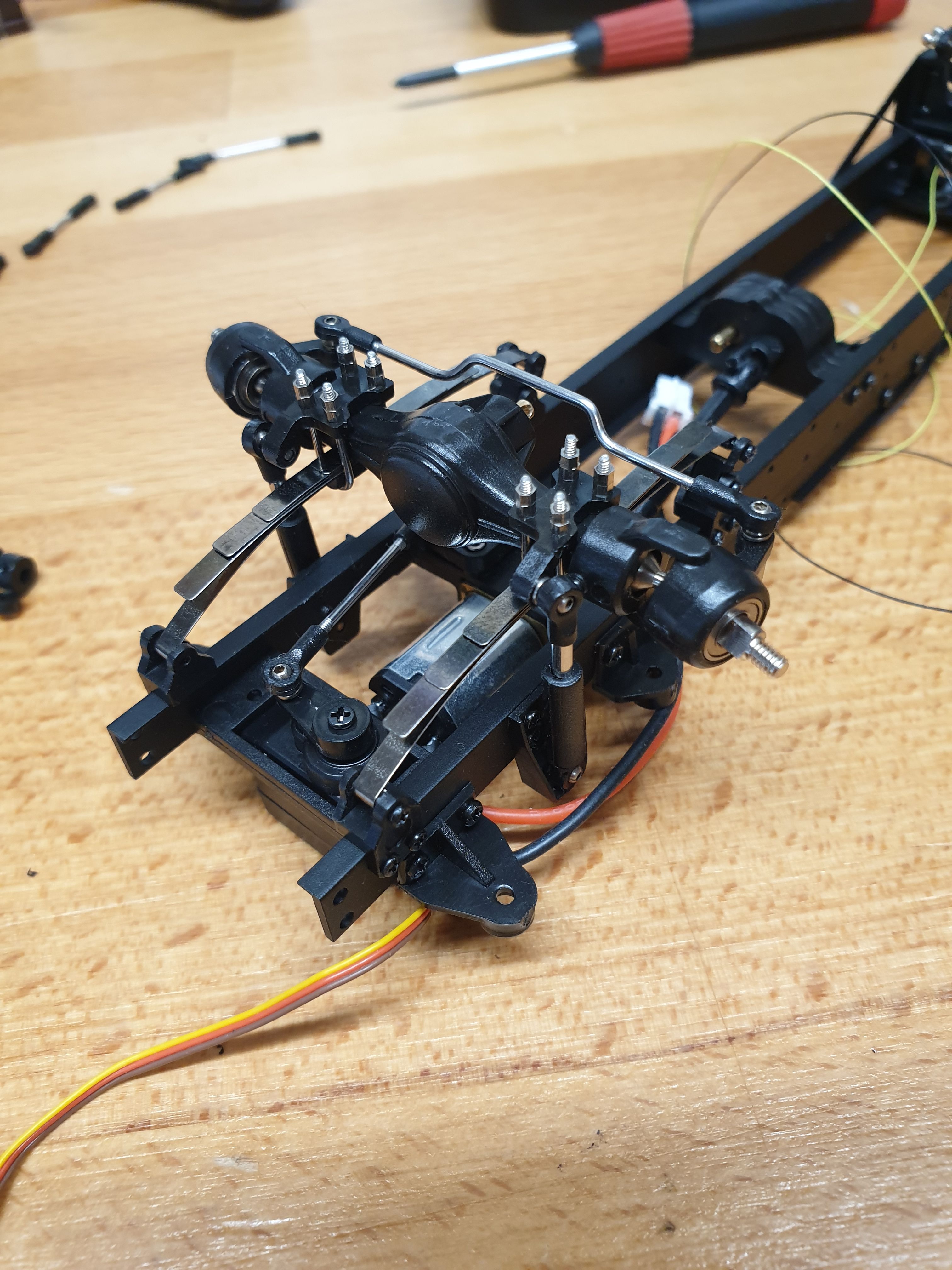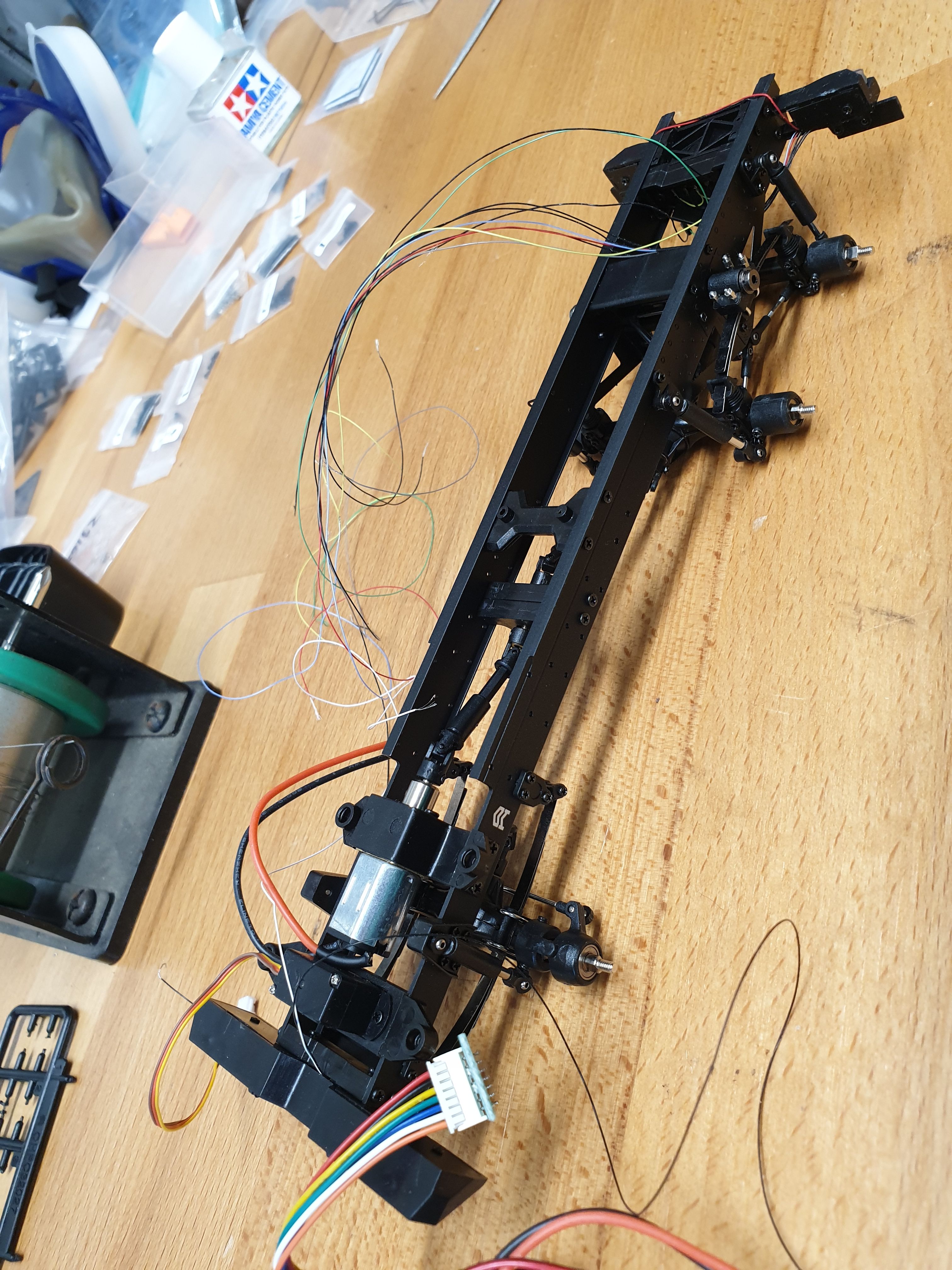 I got the controller and servo and motor wired up. The wheels wouldn't turn at all at first - I think the transfer case was a bit tight - but now spin. But not all in the same direction - I managed to build both back axles the wrong way around. One fixed, one to go.