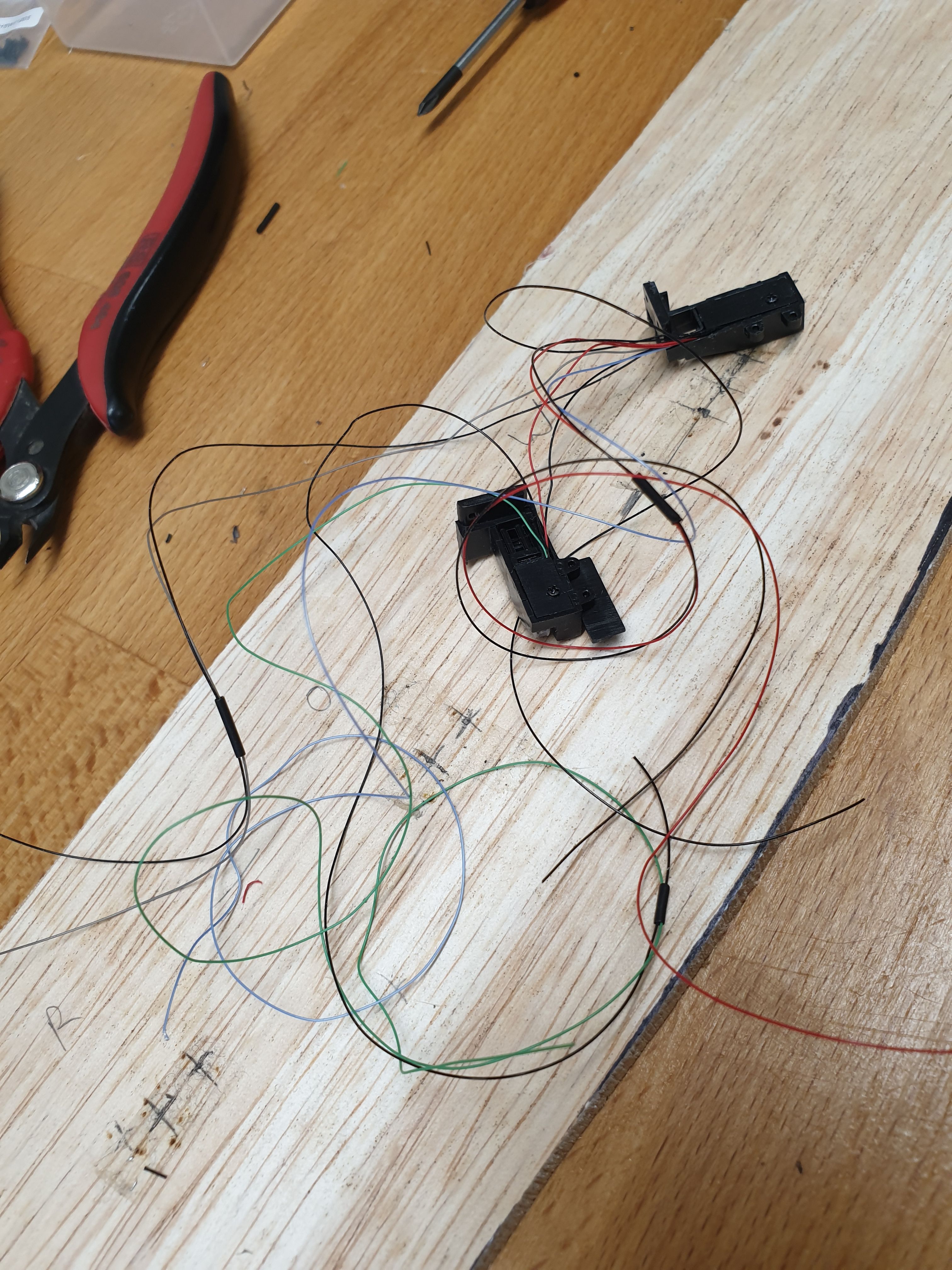 And if you thought that was bad, here's with the bumpers in place and the wires partly threaded through the chassis. I'll put all of these through some more tubing to keep them neat, and I've written down what each colour is for (most are obvious, but bLue is left indicator, gReen is right, grey is reverse).