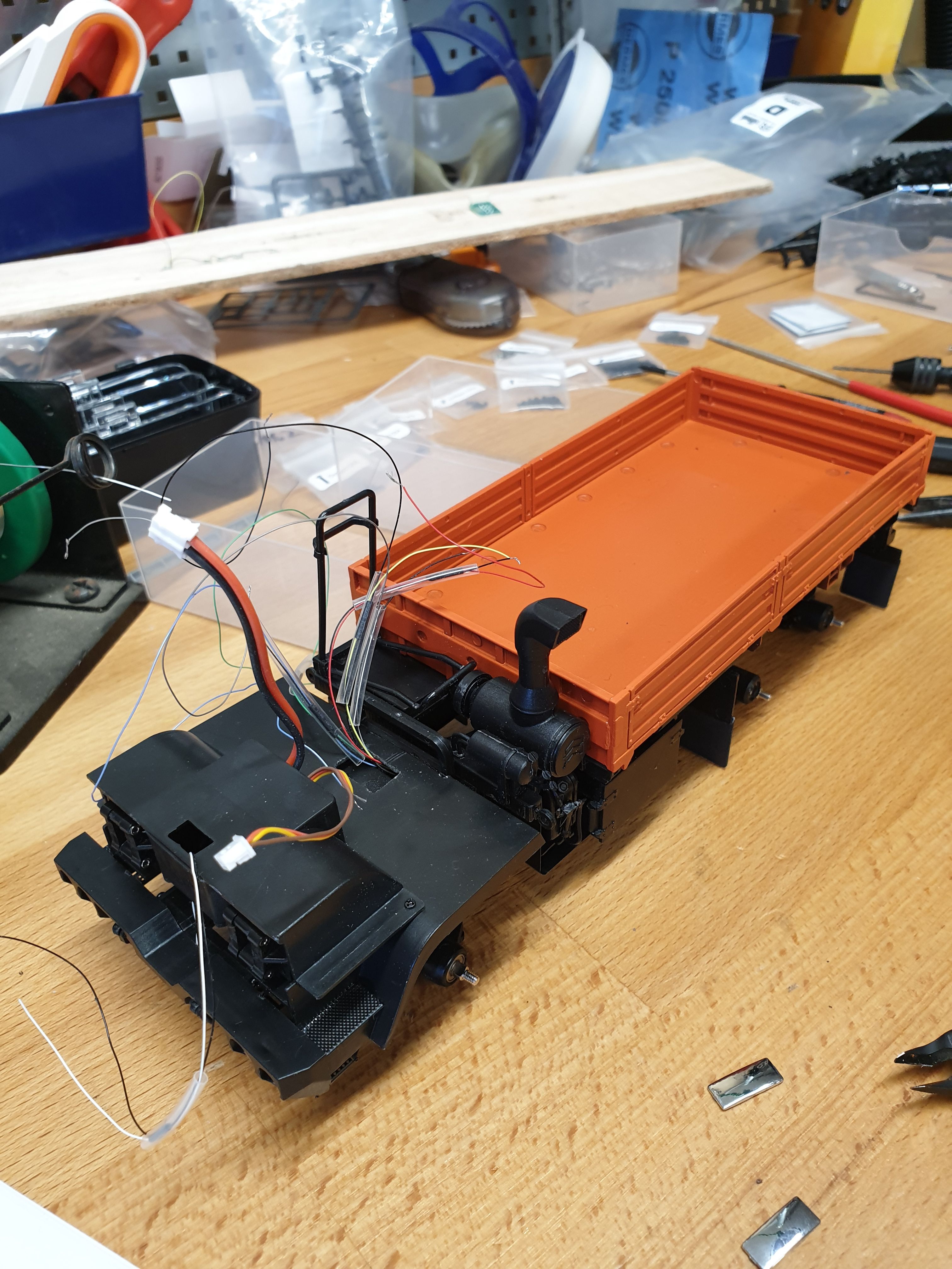 I do need to think a bit more about what bits I want to paint orange, and what I want to leave black and/or grey. The cab is painted, as is the bed (and its sides). Not sure about the wheels and various other bits.