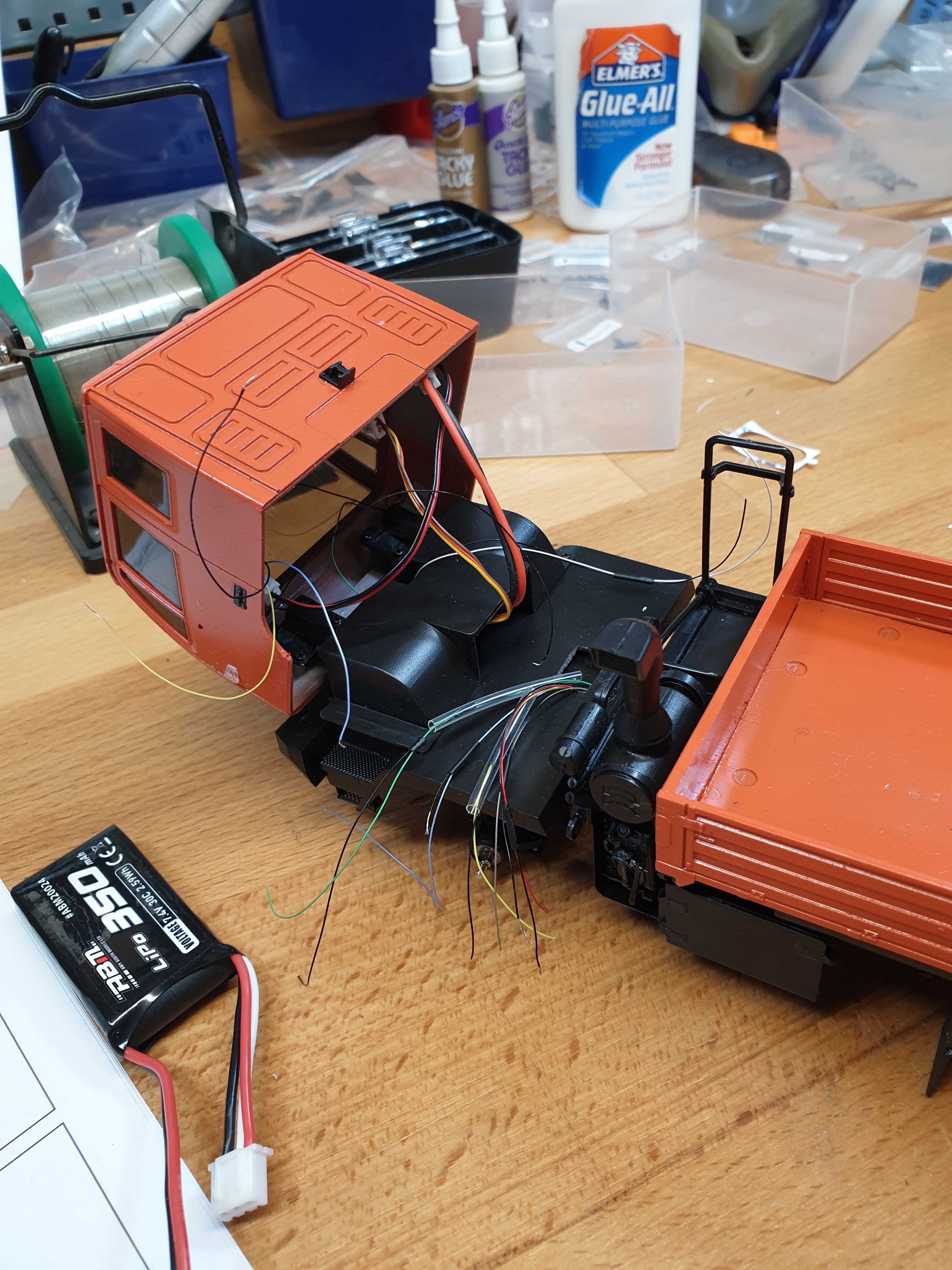 All tested and - quite the surprise - working. I've since stuck the receiver, light board, and speaker to the cab base with more golf grip tape. On the downside I knocked both mirrors off, and one of the horrible little steps. I can't see how I can get the latter back on without taking a lot of things apart, so let's assume it's right hand drive and the passenger can just jump in.
