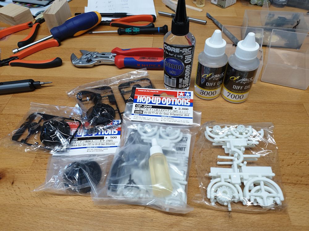 Next the diffs. The XV has the option to have 40-tooth diffs at each end, or to put a 39-tooth at one end or t'other. That lets you create forward bias or reverse bias. I went reverse bias because oversteer is more fun. Tamiya recommend putting in either a slipper clutch (£60ish!) or a third diff (£35ish) in the middle if you're not using 40-tooth at both ends. The third diff needs to be pretty darned stiff, so I'm doing 7,000 oil at the front, 3,000 at the back, 30,000 in the centre.