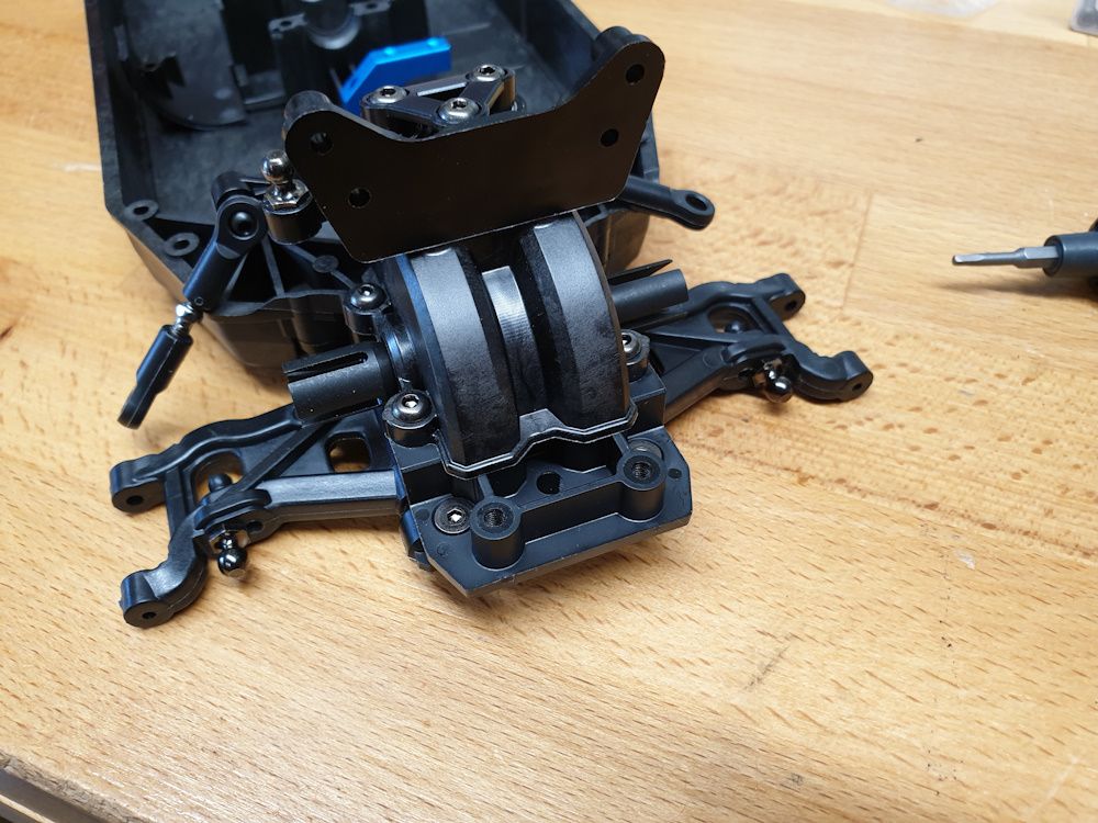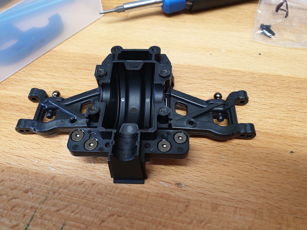 But begins with assembling the front arms to the lower part of the front diff housing. Teeny bit of wiggle in the arms so I added shims left over from the diffs - 0.1mm each side was just enough.