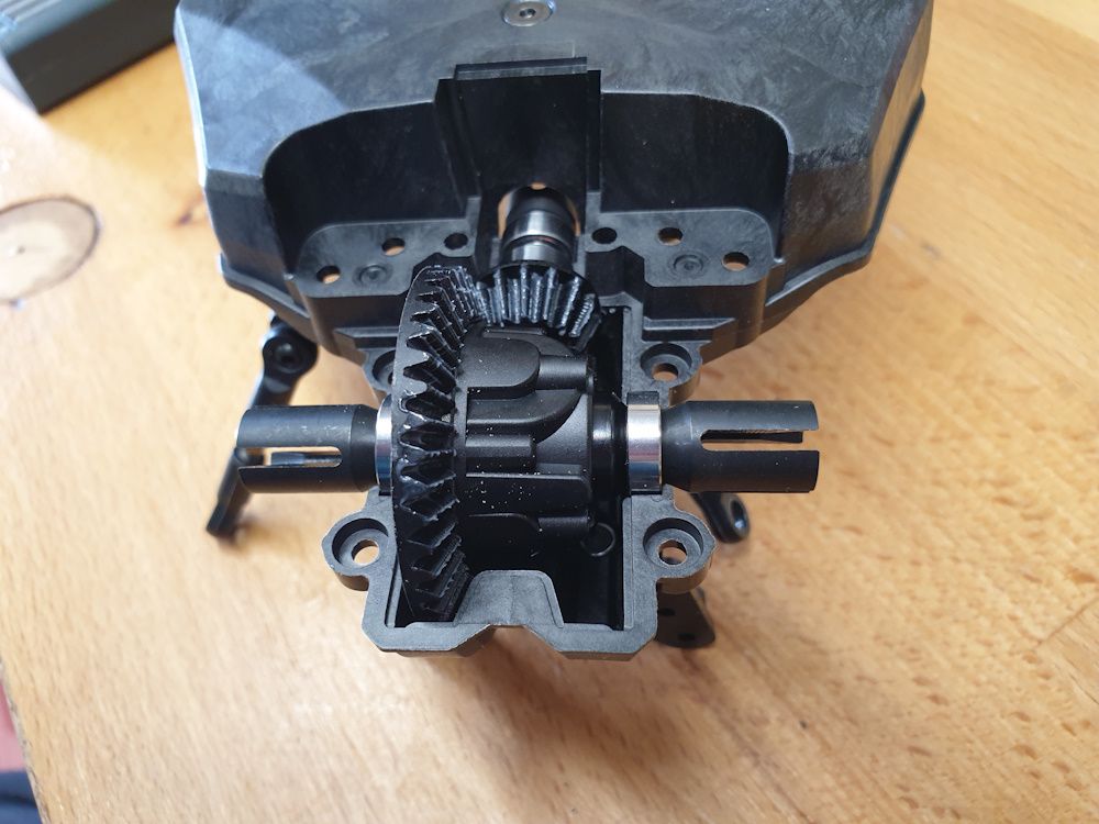 With the tub upside down the diff and its driving gear (note that you get different driving gears to fit with either the 39 or 40 tooth diff) go in.