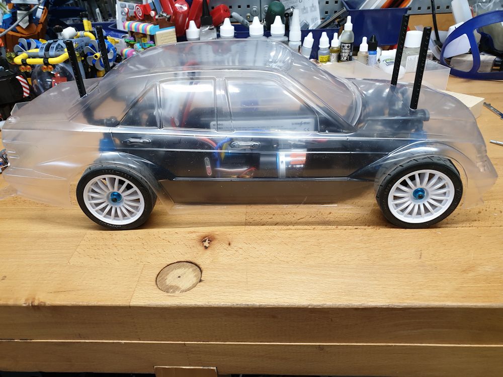 At this stage let's skip the bit where I try a Volvo 850 body but discover that when you cut it out the sides splay out by about 4cm, making it completely unusable. Instead I quite like the look of the Tamiya Mercedes 190E body, but it only comes with pre-cut mounting holes in TT01/TT02 positions.