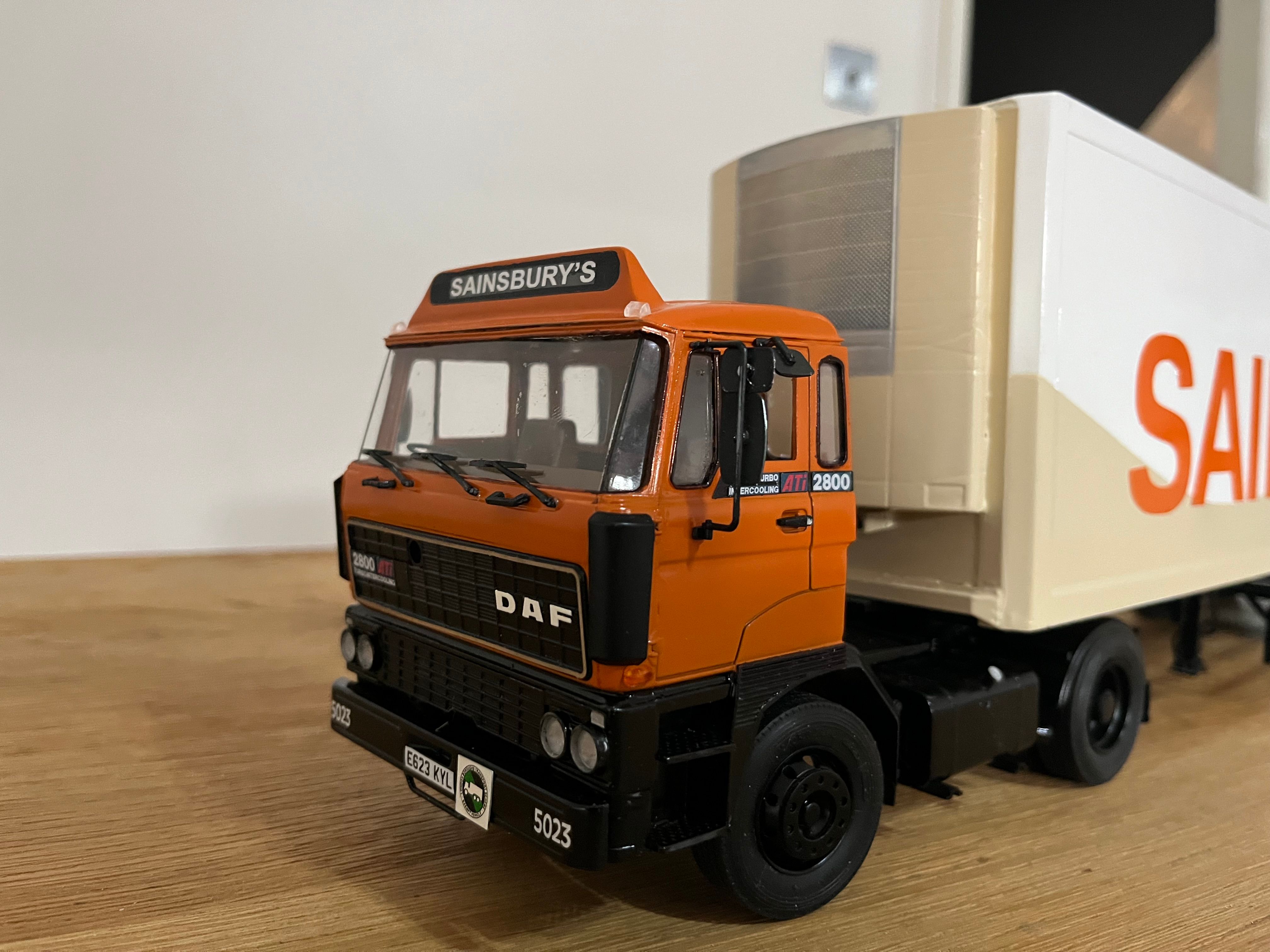 Much kit bashing changing this from a 6x4 with sleeper cab to a short wheelbase 4x2 day cab-quite a few aftermarket bits fitted and a few scratchbuilt bits and pieces-I built this for a friend whose father drove the real one.had lots of issues with the paint on the trailer, but very happy with the end result