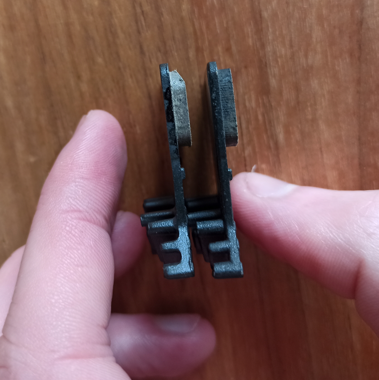 Ordered a new set of pads from our favourite auction site. Initially they looked ok but on closer inspection the quality wasn't quite there, the biggest giveaway was that I vaguely remembered there should be a chamfer edge on the pads (now non-existent on the worn out ones so you wouldn't notice if comparing new to old).