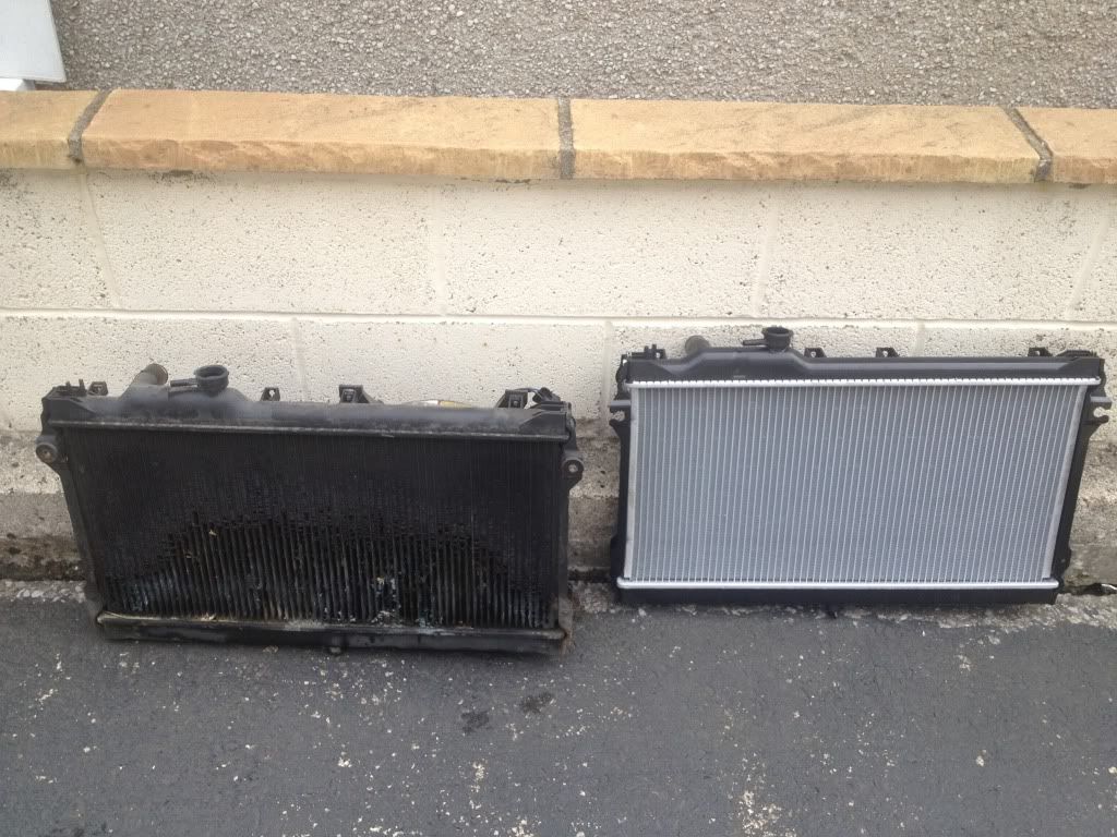 First one, the rad has lost quite a lot of fins and judging by the greeny-blue residue, I'm guessing it is leaking. Prices vary hugely for new ones. Eurocarparts want £116 and there are a few on Ebay for £50-something pound delivered.