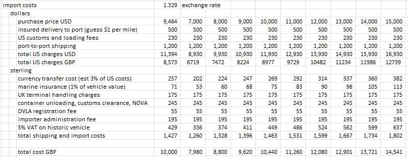 I pulled this together a few years ago so am sure some of the port and registration charges will have gone up but it looks broadly right. Anything I've forgotten?Purchase price. you need to factor in the exchange rate you will get for your money, then transport costs from where you buy to shipping location, shipping costs + insurance, then once landed import duty on all costs then VAT on the total