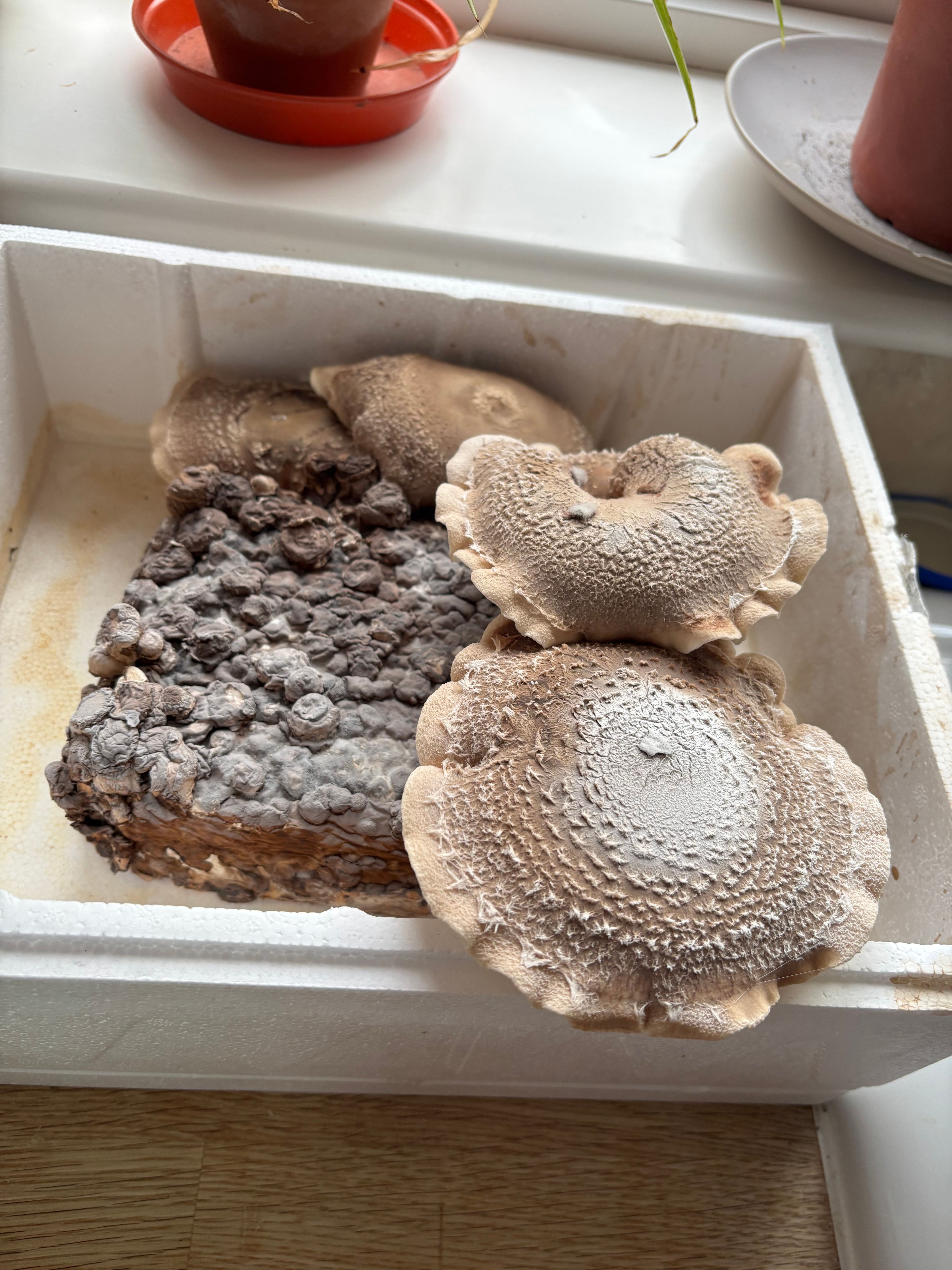 The kit in the photo ordered a couple of weeks before Xmas (from Suttons who I get my seeds from) were incorrectly addressed and went missing… I tracked them down to a warehouse in Norwich but the substrate had by then been in plastic wrap for something like 5 days longer than should have been… I picked them up from the warehouse but the damage was done, which is why a large area of the substrate has no growth… I’m harvesting these tomorrow and will sauté them in butter and garlic