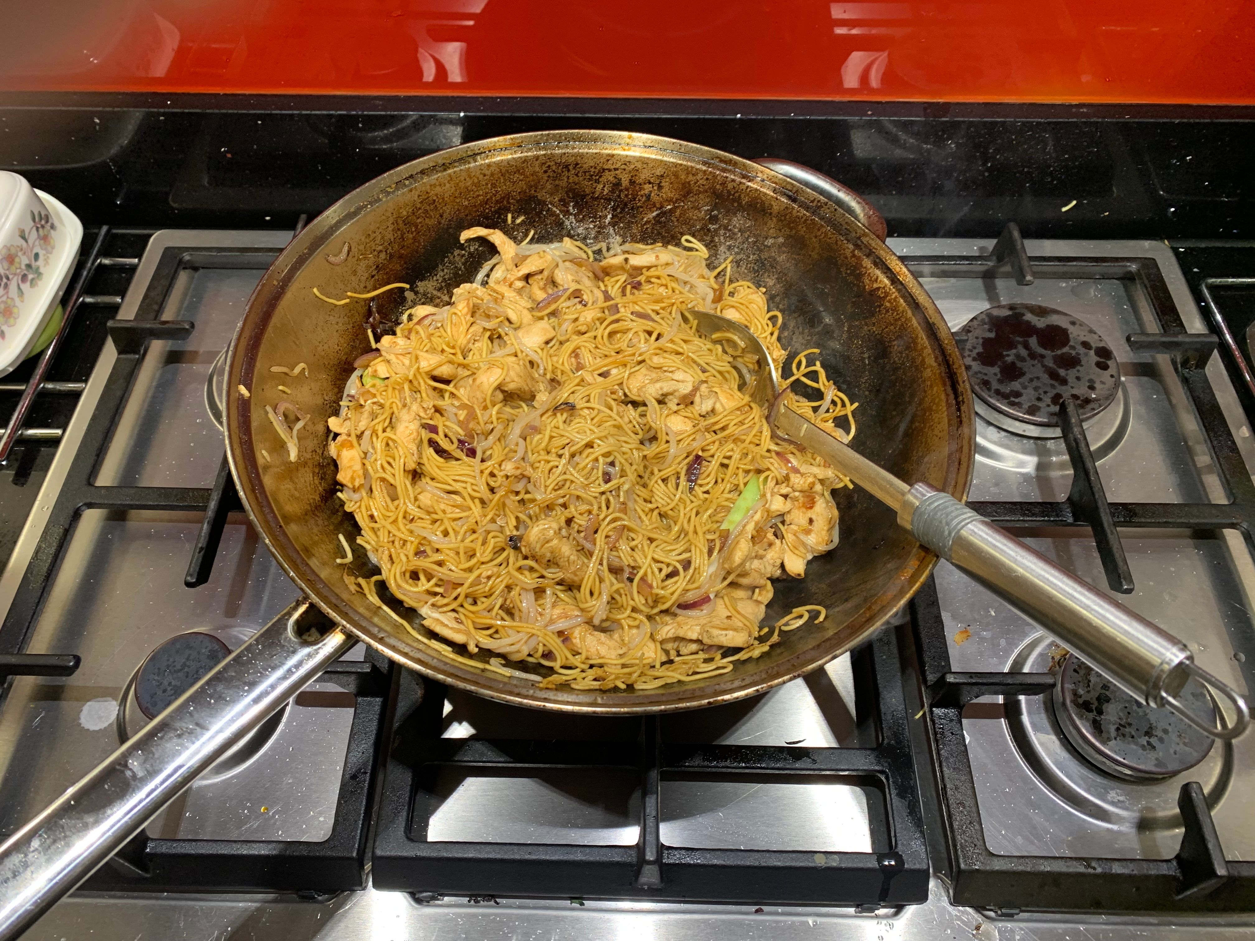 Add a splash of soy sauce and a dash of fish sauce then it’s time to toss the noodles in. As well as some healthy leafy greens. I’m using pak choi like a Tory b