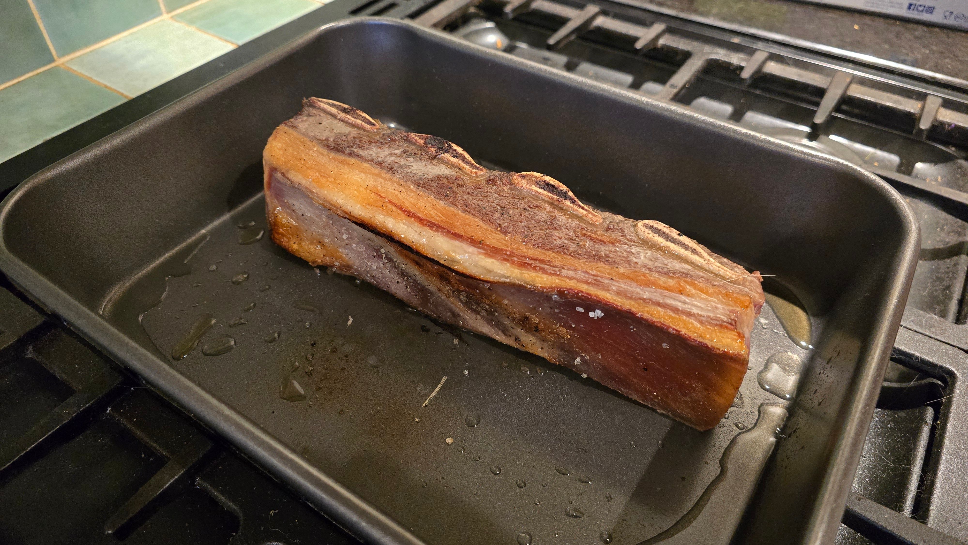 I did a Jacobs Ladder yesterday which had been in the freezer since last Christmas. I could not be arsed with faff so browned it off in a pan, poured in a bottle of red wine and a pint of stock made with two Oxo cubes and some fresh thyme. Covered in foil and in the oven at 150 for three hours. Took it out to rest covered for an hour and poured some of the liquid in to pan to reduce whilst I made some mash and steamed some veg. Was really nice for a simple rustle up. The meat was lovely and tender. The only pic I remembered to take however was while browning it off so you'll have to take my word for it.