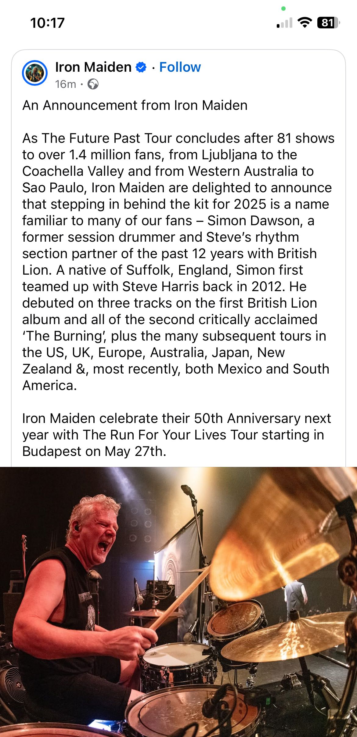 My mate messaged me earlier about this, we're going to see them in Manchester next year. Gutted that Nicko won't be on stage (the first time I'll have seen Maiden without him behind the kit) and a sad reminder that time catches us all. I have to remind myself of how many decades it has been since I bought my first Iron Maiden single and drove my parents mad playing it over and over again. Wonder who will step in?