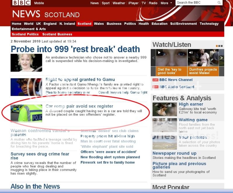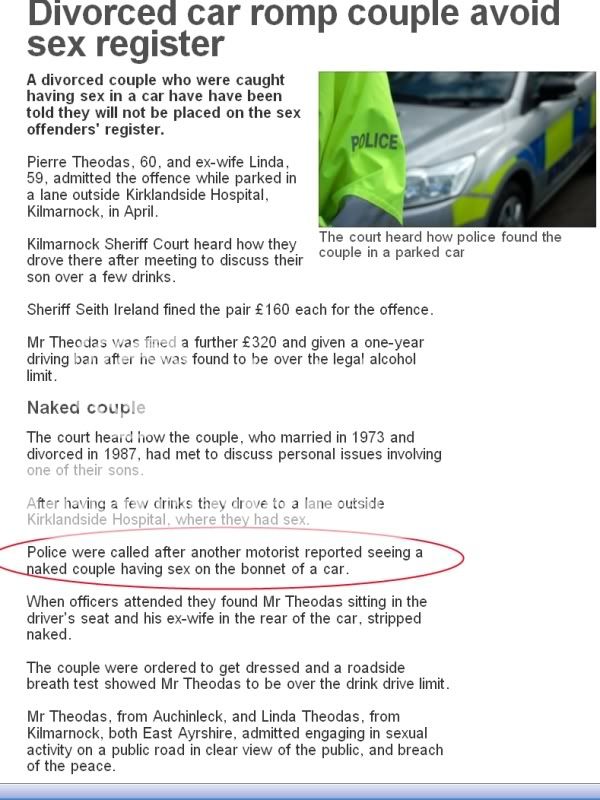 BBC main Scotland news page says couple done for having sex in car.
