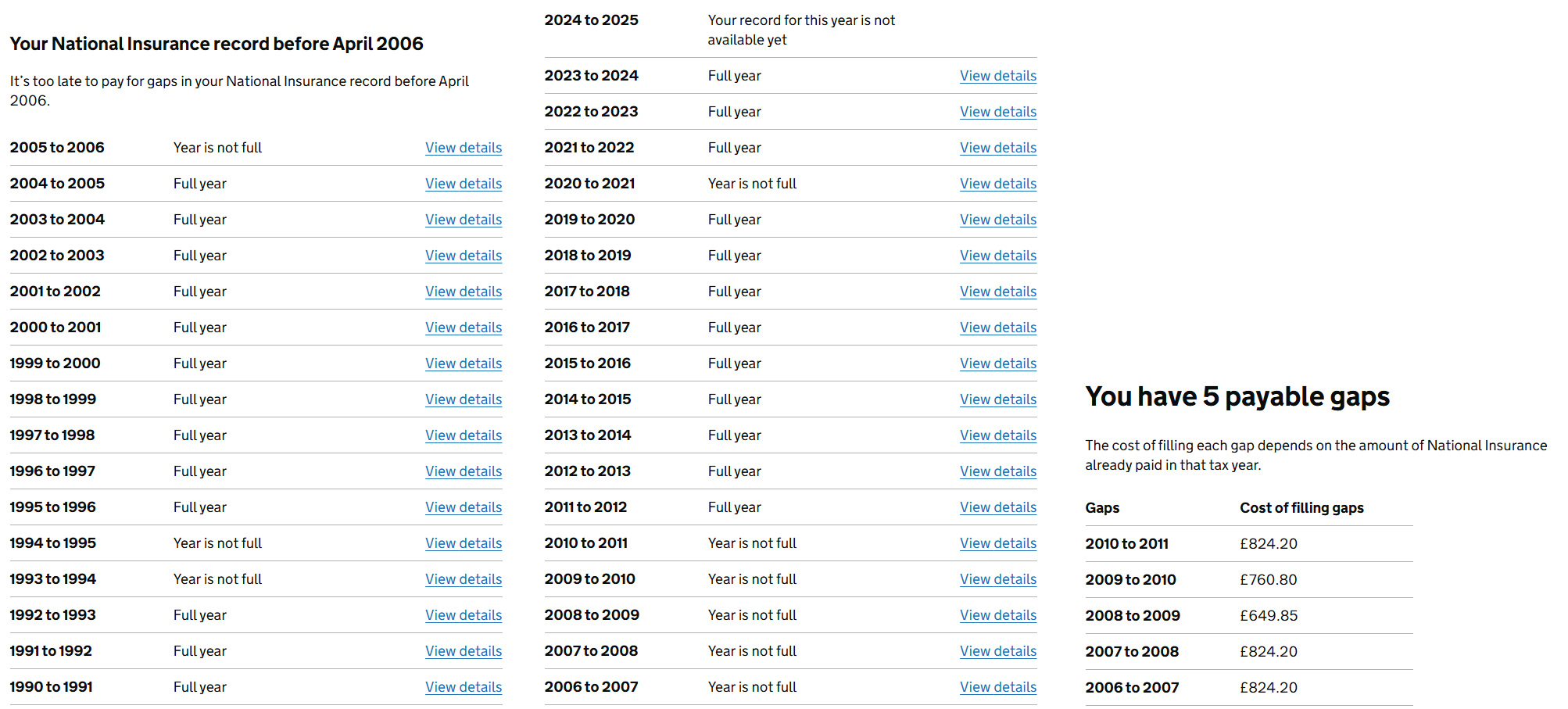 My contributions history - I don't know why I can fill in years between 2006 and 2011 but not 2020/2011 when I was off work caring for my mother full time. Also, I don't know why 1993 to 1995 are counted as not full - I was in full time education at university: