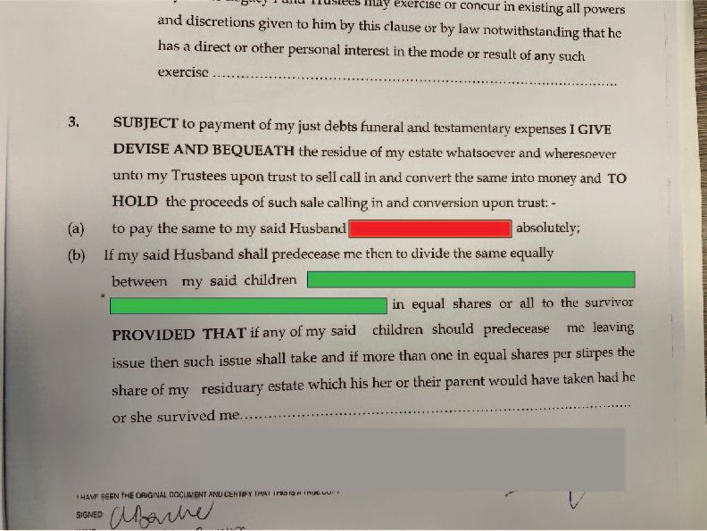 Anyway, below is the will blanked out names, Red = Husband Green = Me & Brother, im confused on section 3 as to what the wording means,