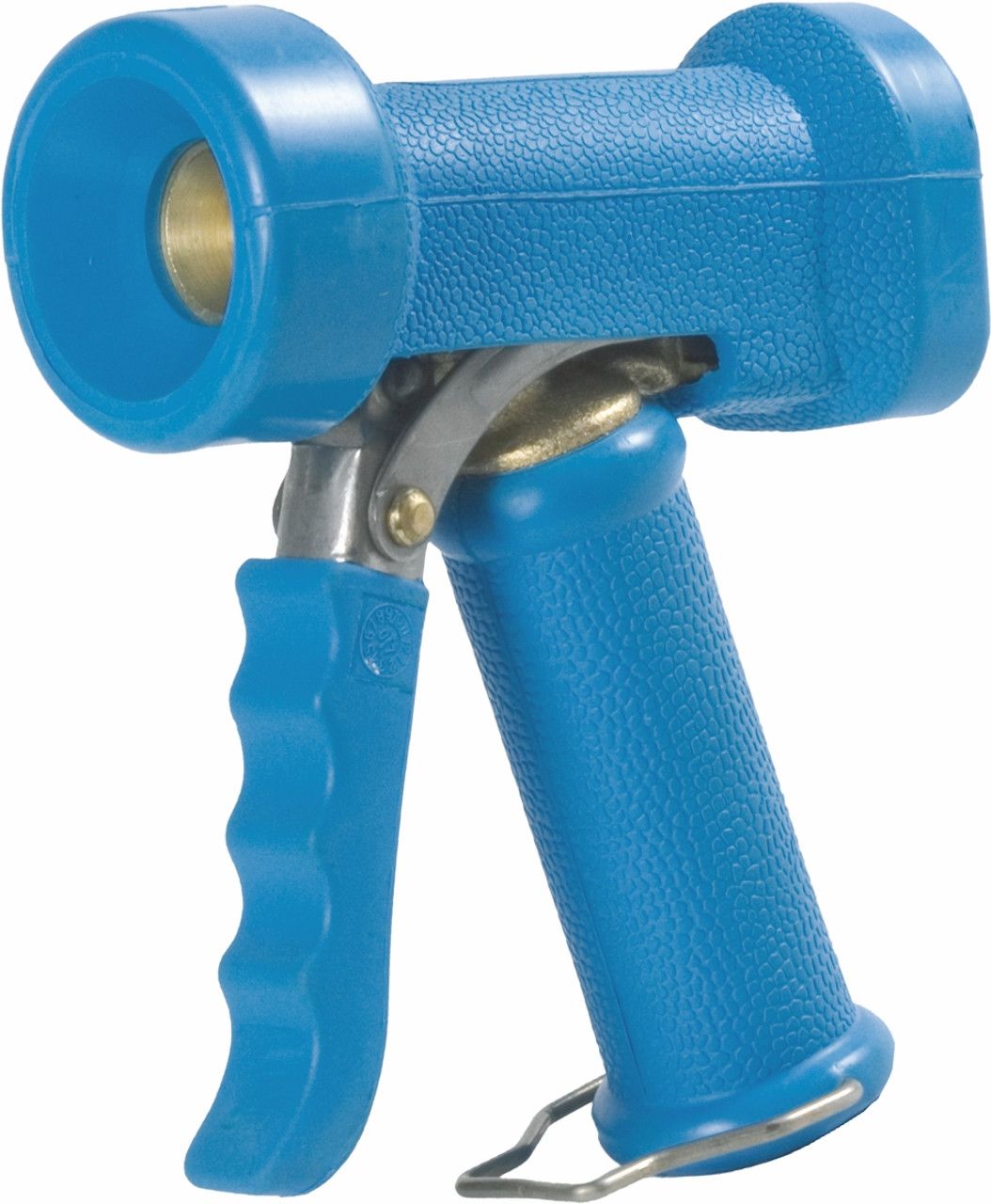 The thumb control type on/off valve is a simple solution which allows you to set and control the flow level, the twist nozel gives you the standard wide spray> fine stream. No need to hold a trigger which is welcome if you are using it for any length of time.