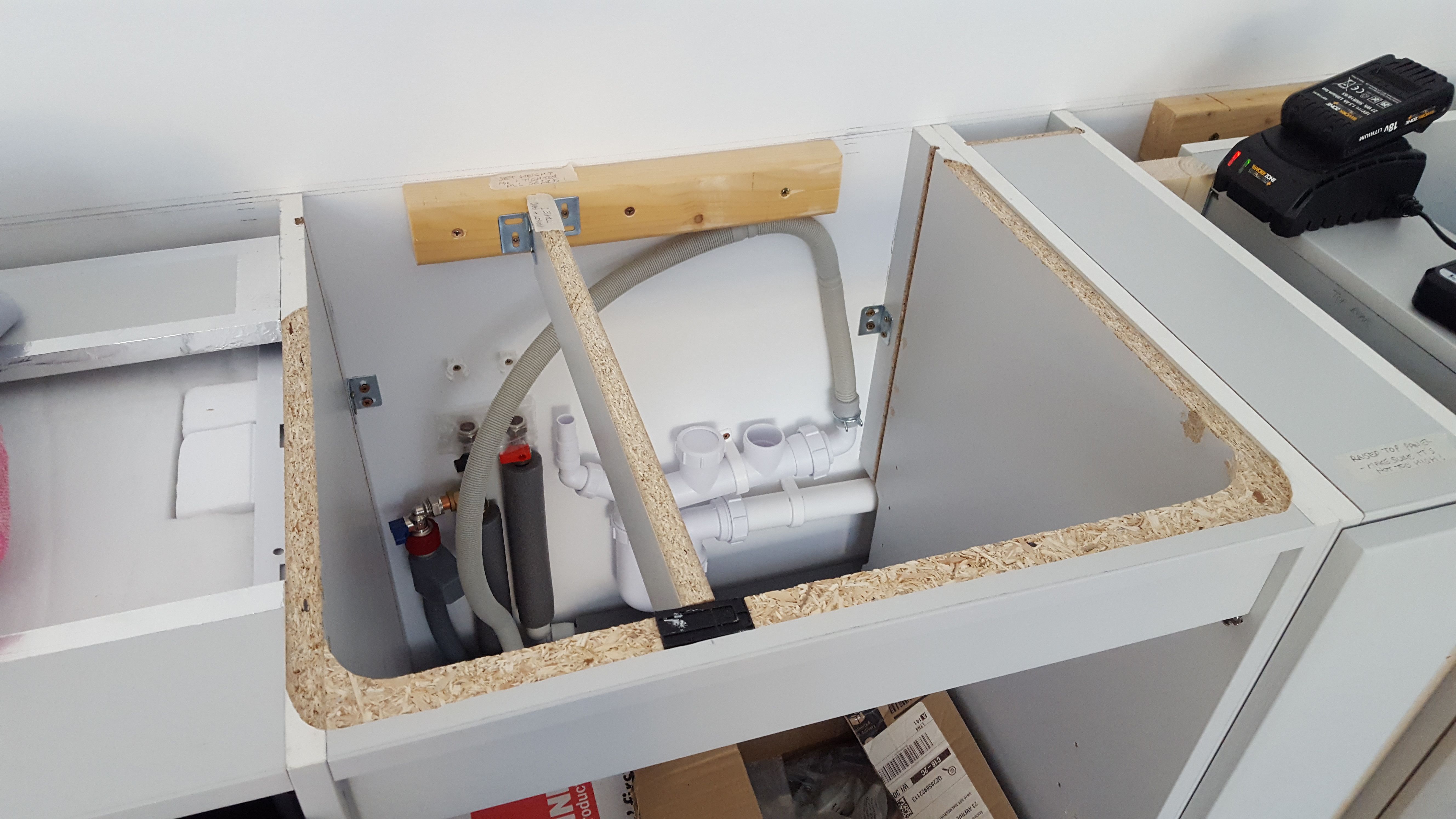 In our case we had a simple 1.5 bowl sink which was relatively small and fitted within the a full standard 600mm cabinet width. I rebated the top edges to provide a flat mounting surface for the worktop and included a cross-beam for additional support which was probably overkill but easy to do before the worktop was installed and didn't impact storage below.