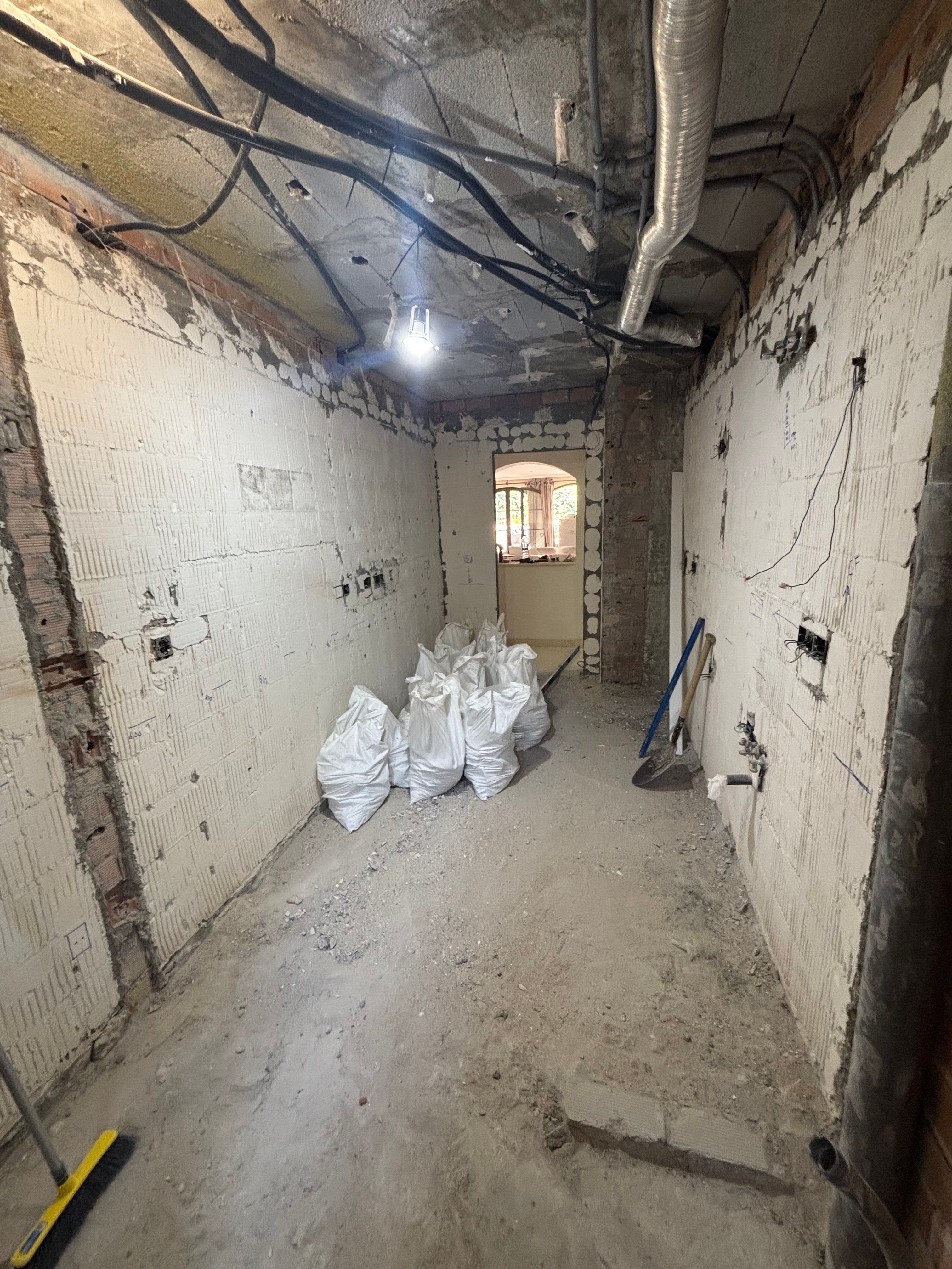At the end of the day 1 most of the demolition is done... ceiling down, walls stripped, utility room wall out, most of the partition wall down, water heater drained and removed... and all the ruble bagged abd cleared ready for the skip coming.