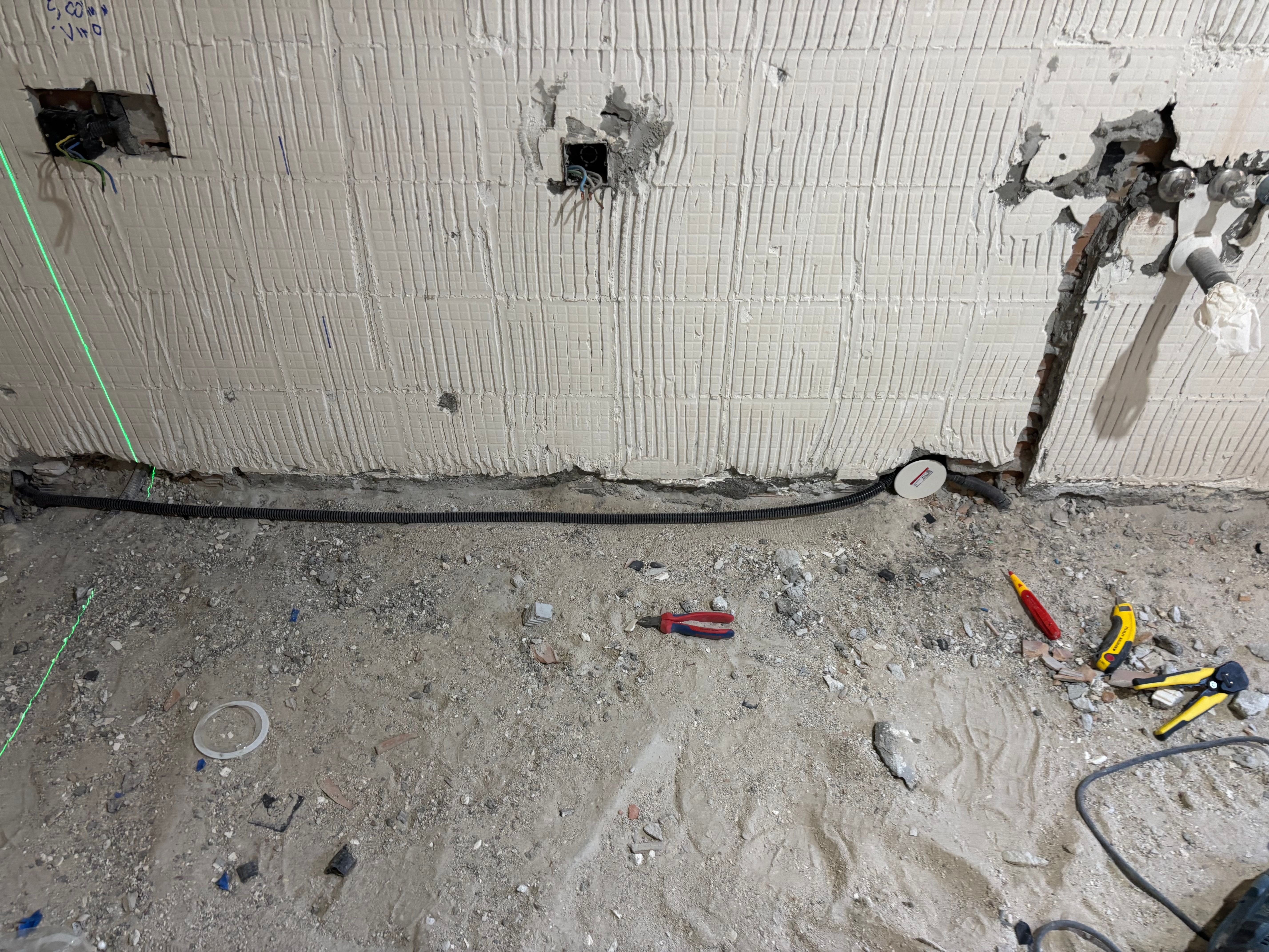 Stripped the pillars at both ends back to bare brick/concrete (they won’t be visible when the kitchens in so they’ll just get a quick skim)… there’s virtually no slack to play with across that wall (maybe 15mm), so every bit of extra space I can find means I won’t get to the end of the run and find the washer doesn’t fit