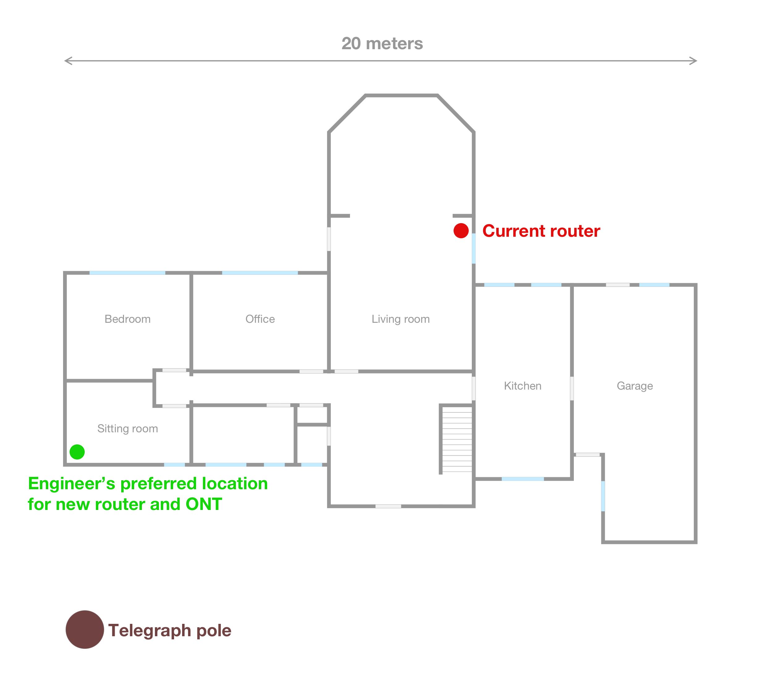 I've attached an image showing the current layout of my house, where the current router is situated, the proposed new location of the router and the telegraph pole where the feed needs to come from.