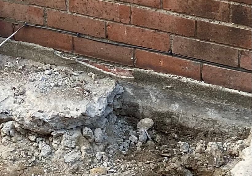 Could it be behind the render that seems to be over the first brick? The concrete drive looks thick / high, it goes close to the bottom of the air brick. Looking for other pics. Maybe I should knock that render off and try and find out?