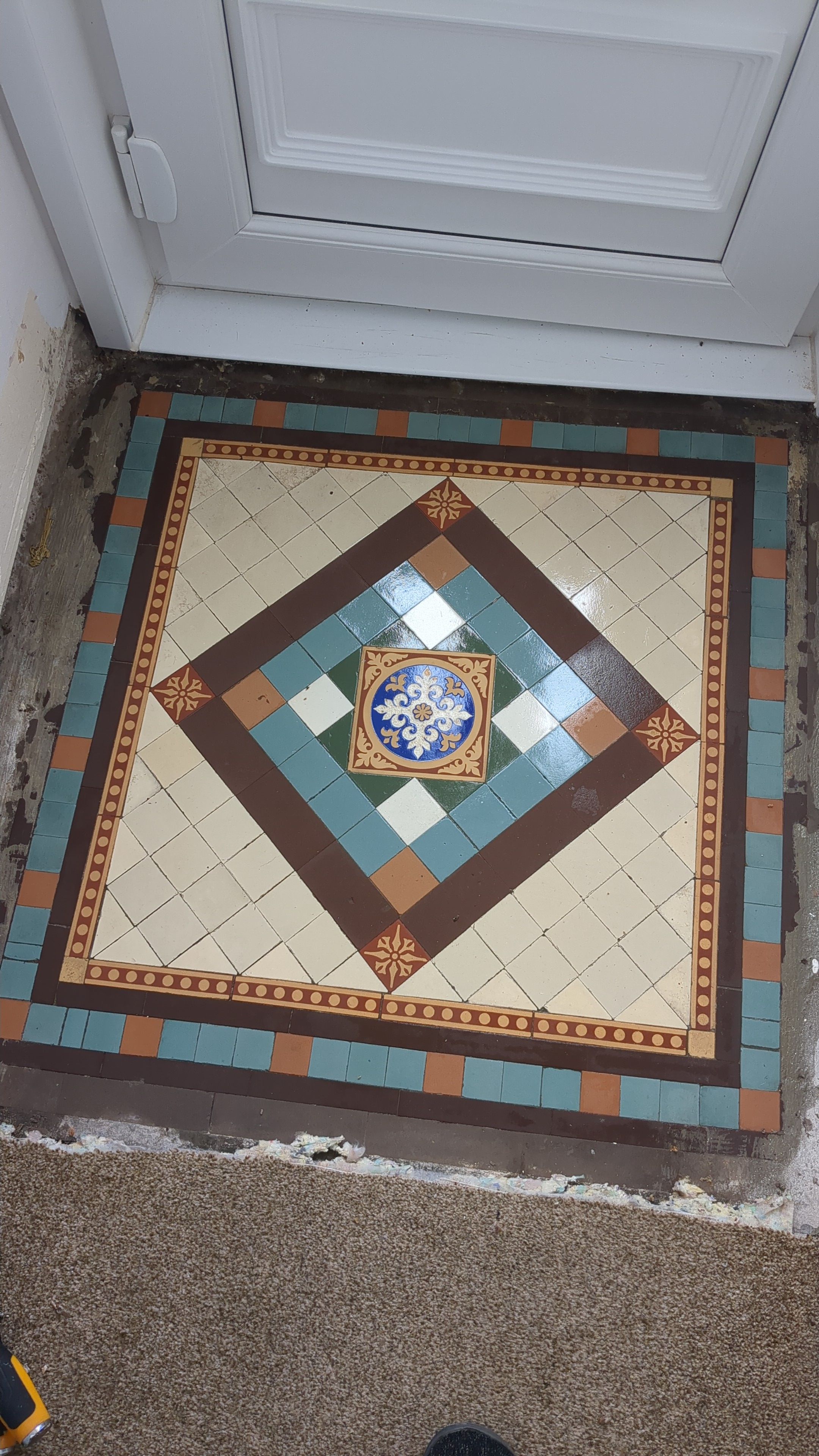 Encaustic tiling like that was typically throughout the whole hall. If it's still there it could be lovely and make you want to change the plastic door back to a nice hardwood one. wink