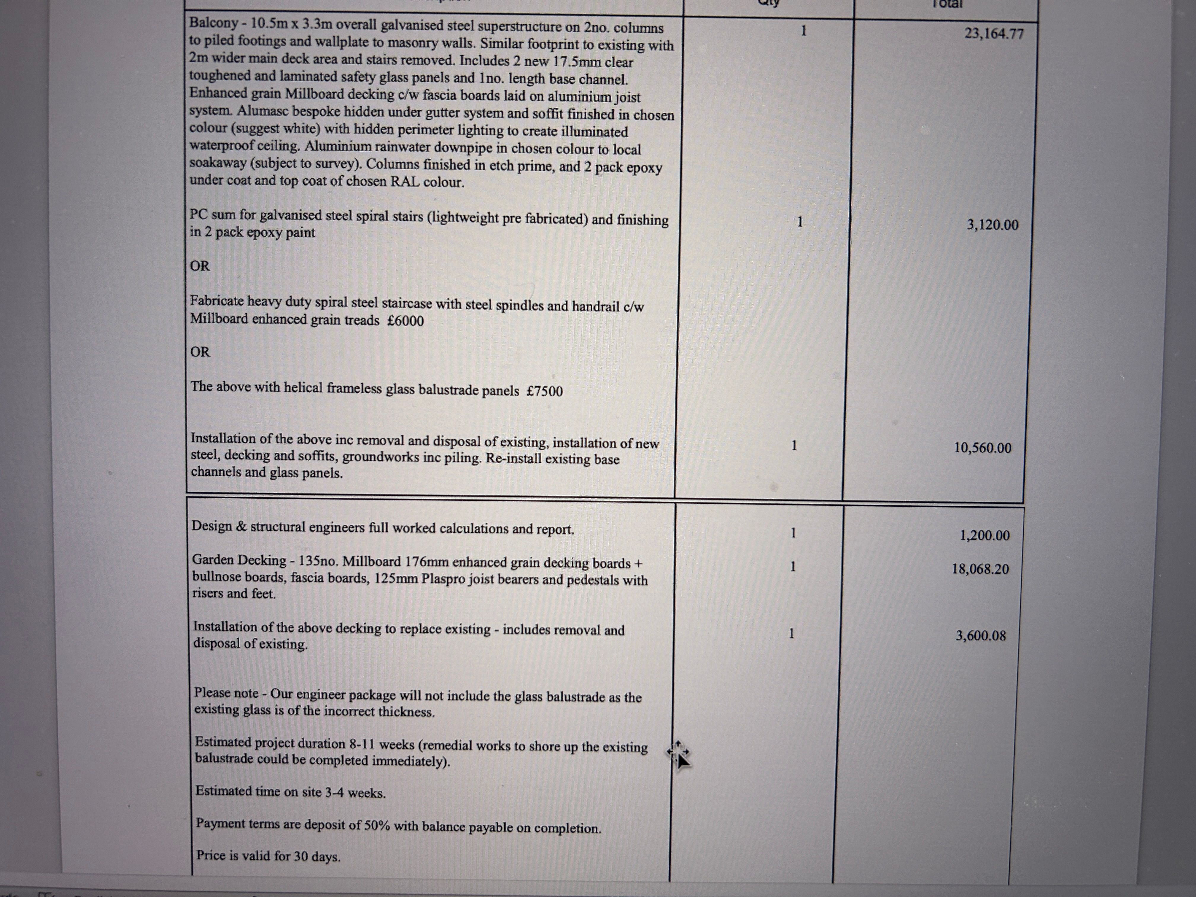 What does this actually mean? Do you have more photos? It sounds a bit catastrophic when the picture shows what looks like a perfectly fine balcony with a slightly wobbly balustrade. If nothing else a sound balcony hasn't become unsafe in 2 and a half years unless the surveyor truly phoned it in.Pricing in quote is ex VAT.