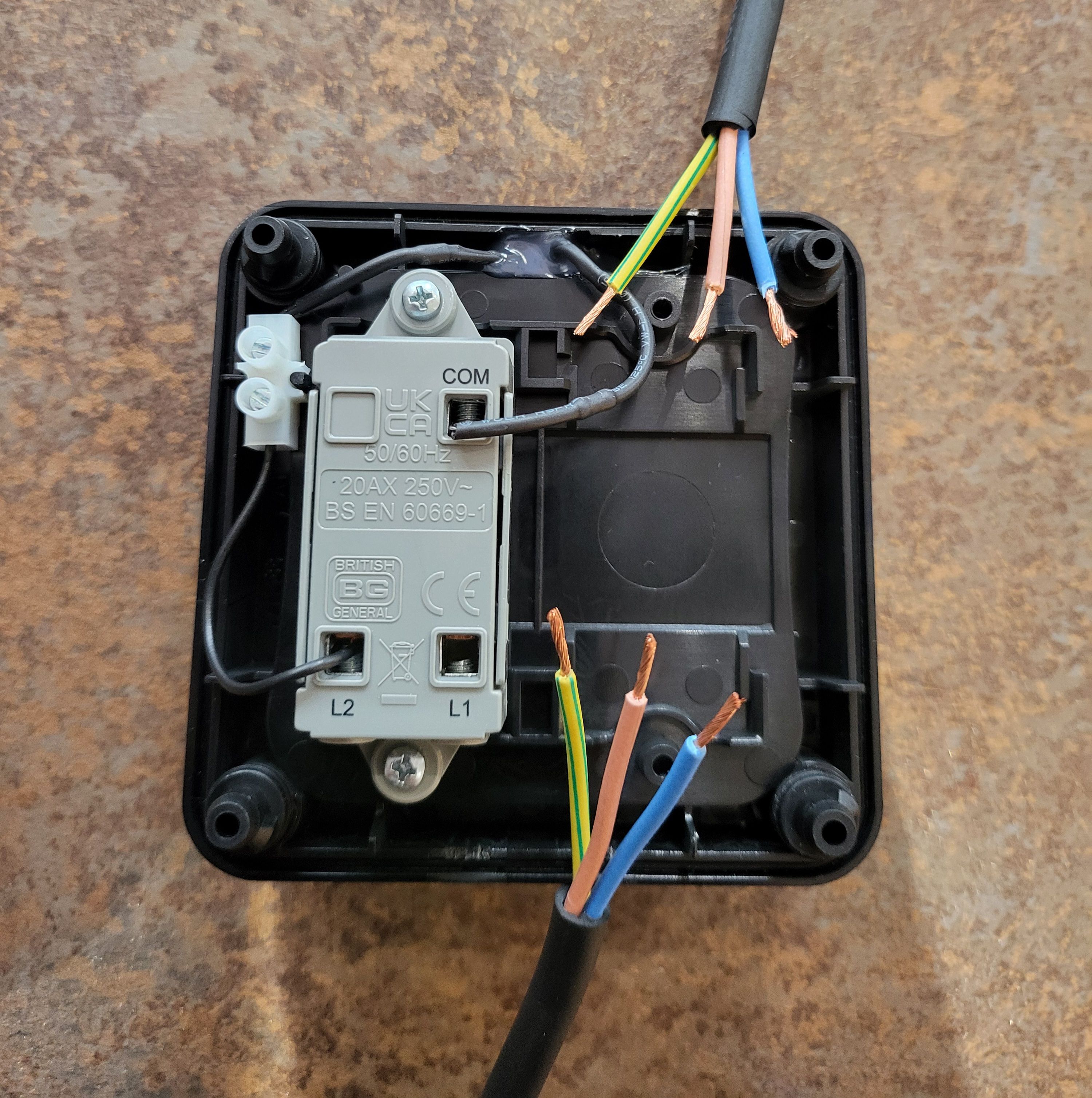 It's an external switch. The cable is waterproof pond cable, using it for a short run to an external LED light so i don't have to keep reaching the socket to power it off. The black wire is pre-installed on the switch. I'm assuming i can move this to where required?