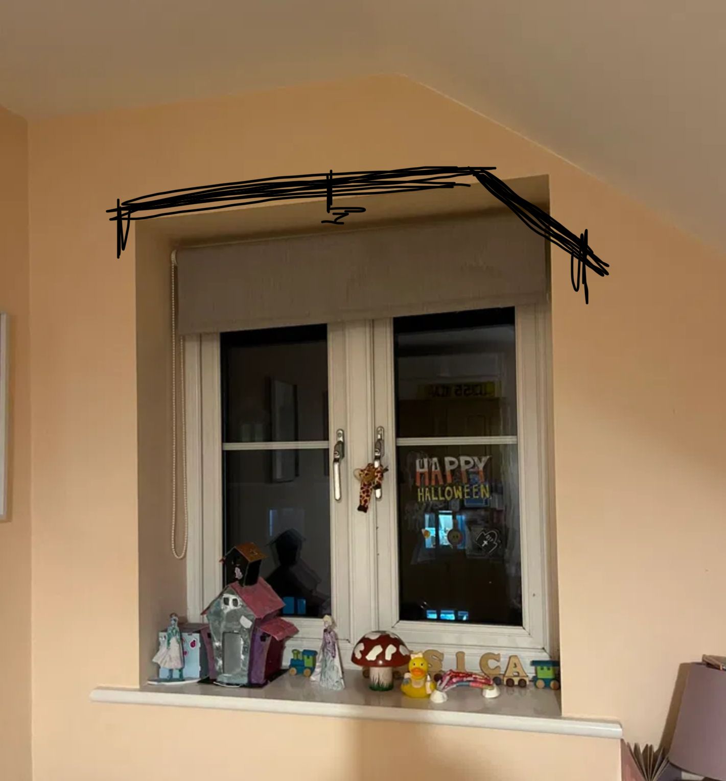If that sloping bit is plasterboard you could make investigations...Thanks for the suggestions, plantations shutters look quite good.